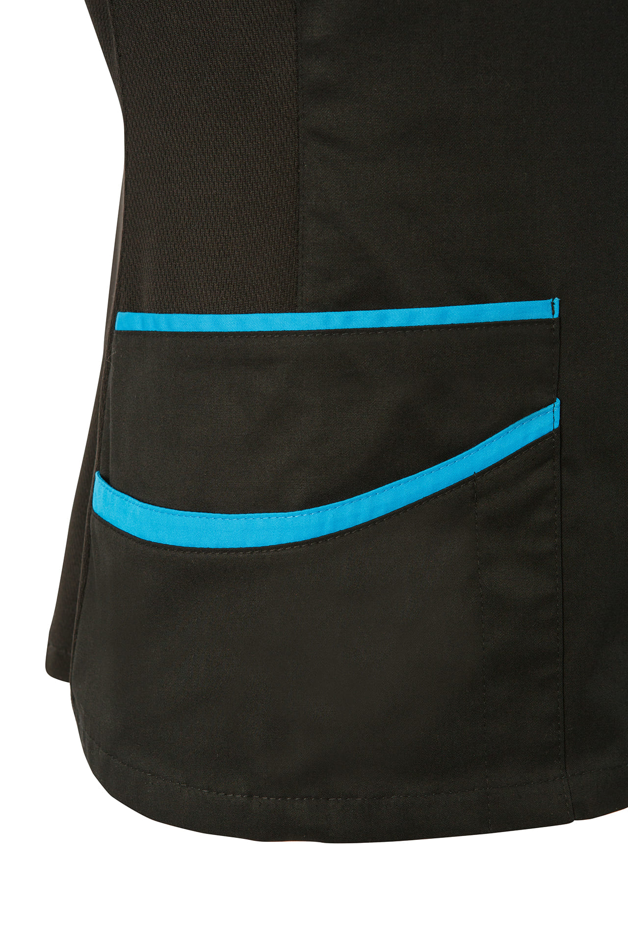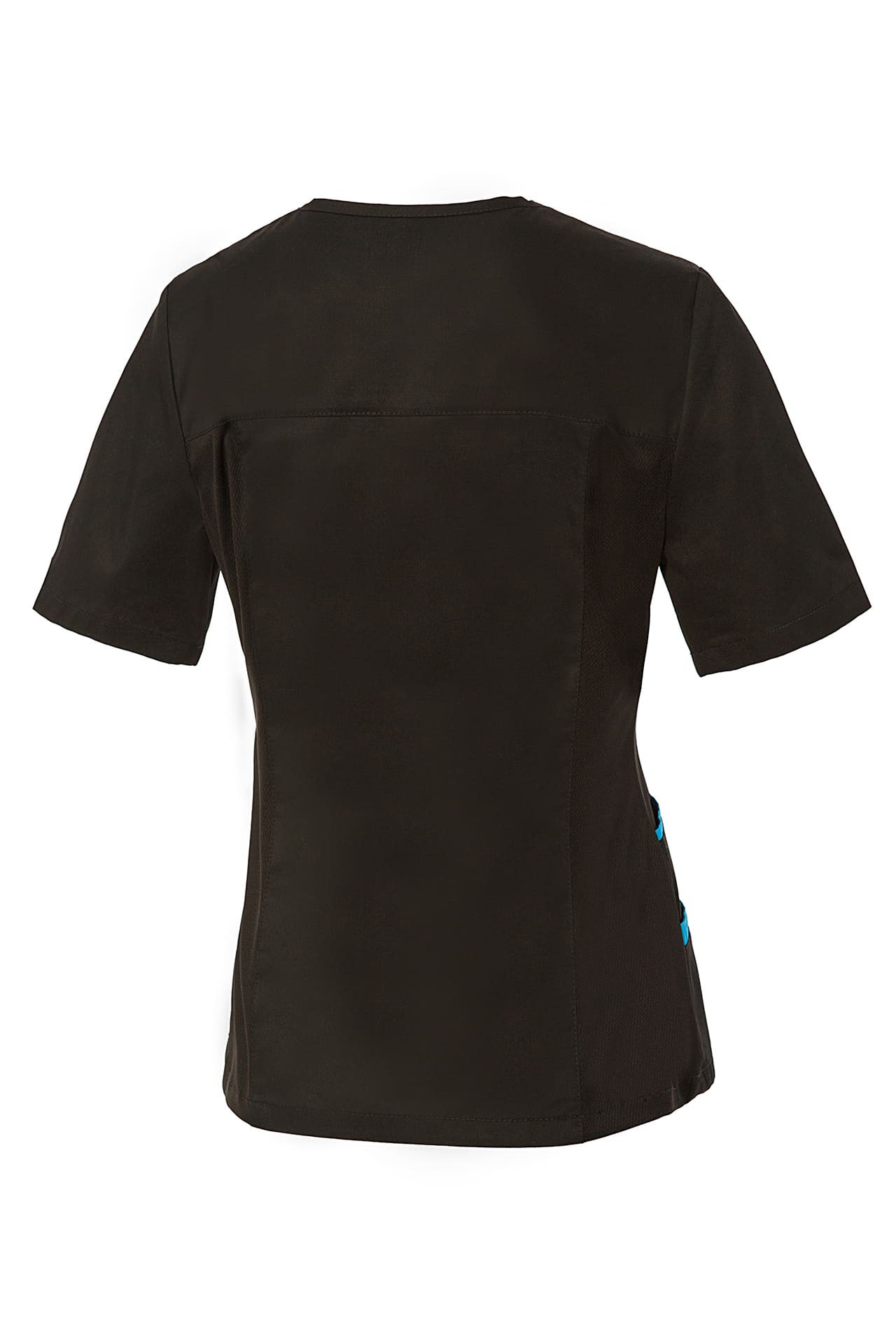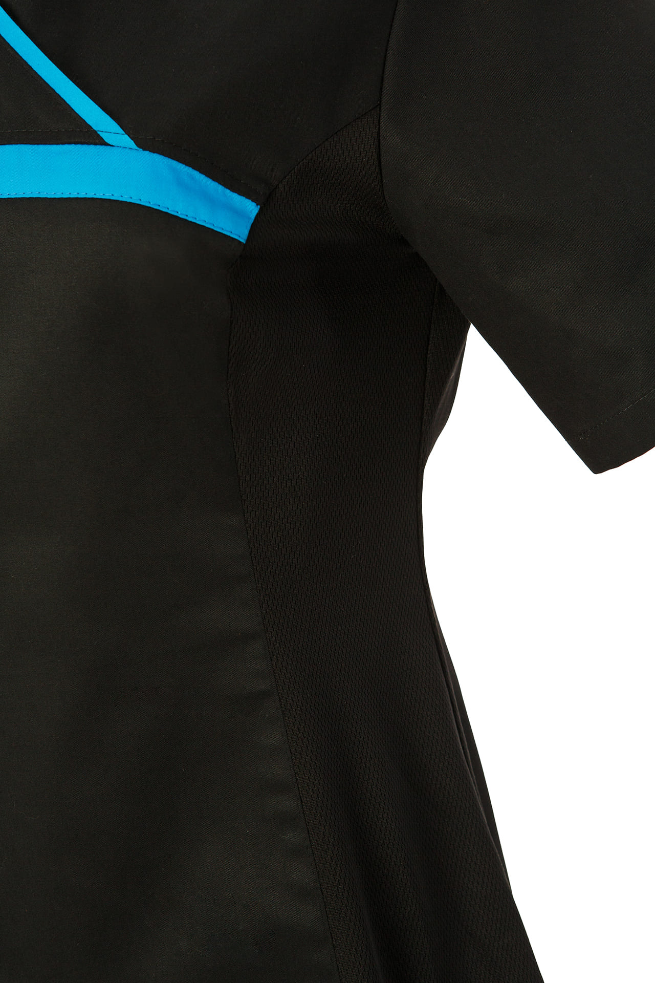 Блуза с V-образным вырезом, приталенного кроя с рельефными швами и короткими втачными рукавами. Спереди располагаются два вместительных кармана, подходящие для мобильного телефона и инструментов. По бокам специальные вставки из трикотажной сетки, способствующие удобству в носке за счет циркуляции воздуха в пододежном пространстве.