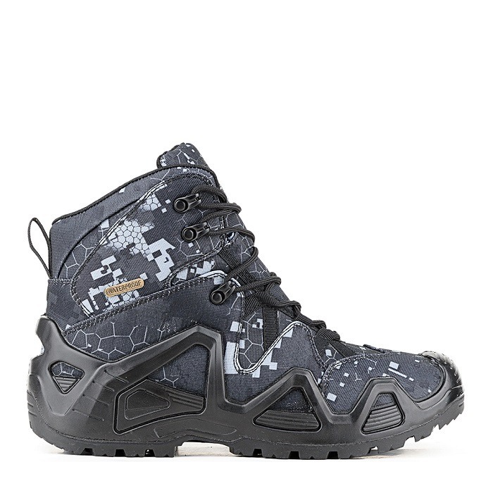 Специальная разработка дизайна подошвы с высокой упругостью выполнены с помощью технологии High Poly Modeling, ее особенность – боковая поддержка и фиксация стопы, что является важным аспектом в условиях неровных поверхностей. Водонепроницаемая мембранная система подкладки соединяет водостойкий внутренний слой с верхом, создавая барьер, препятствующий проникновению воды.