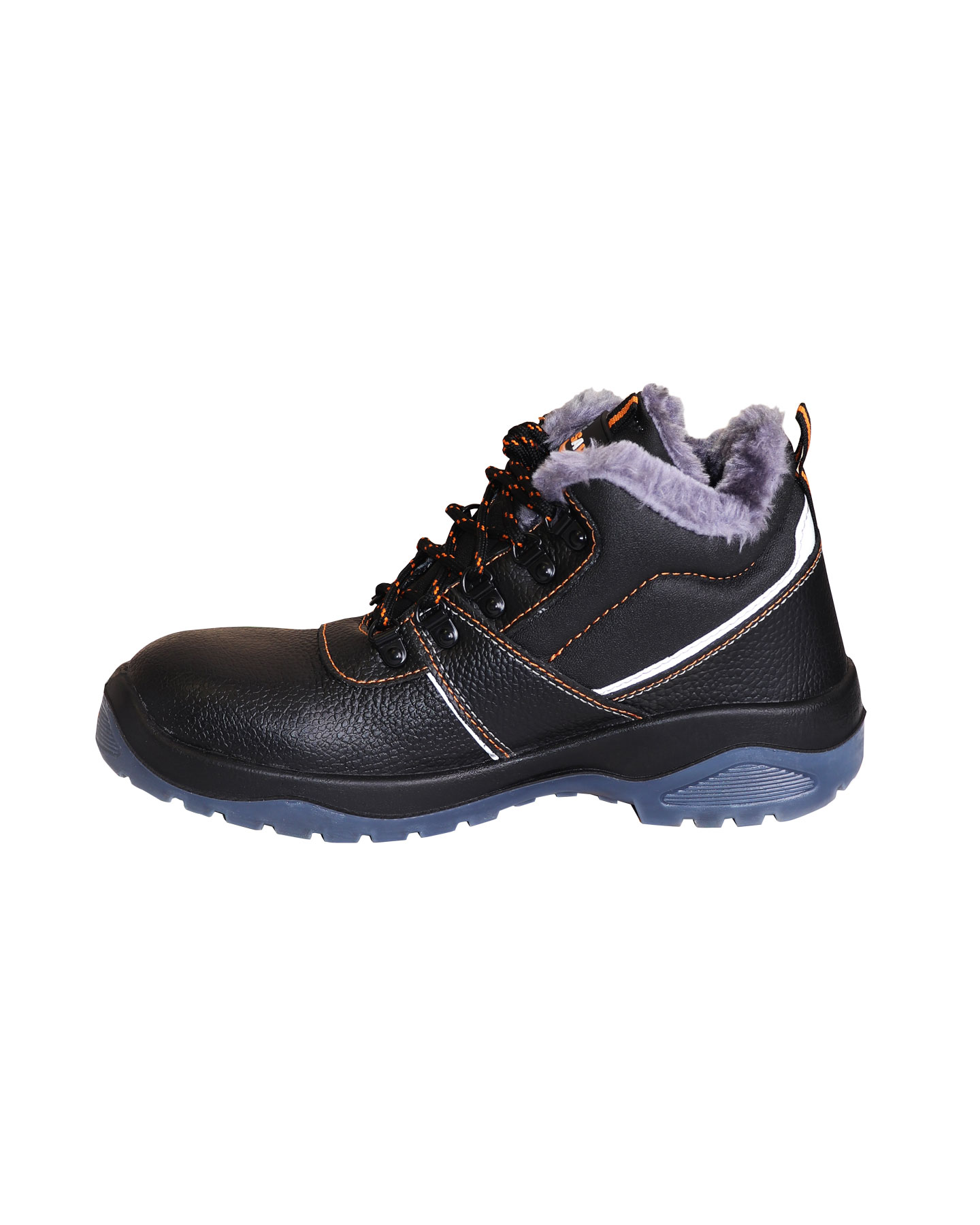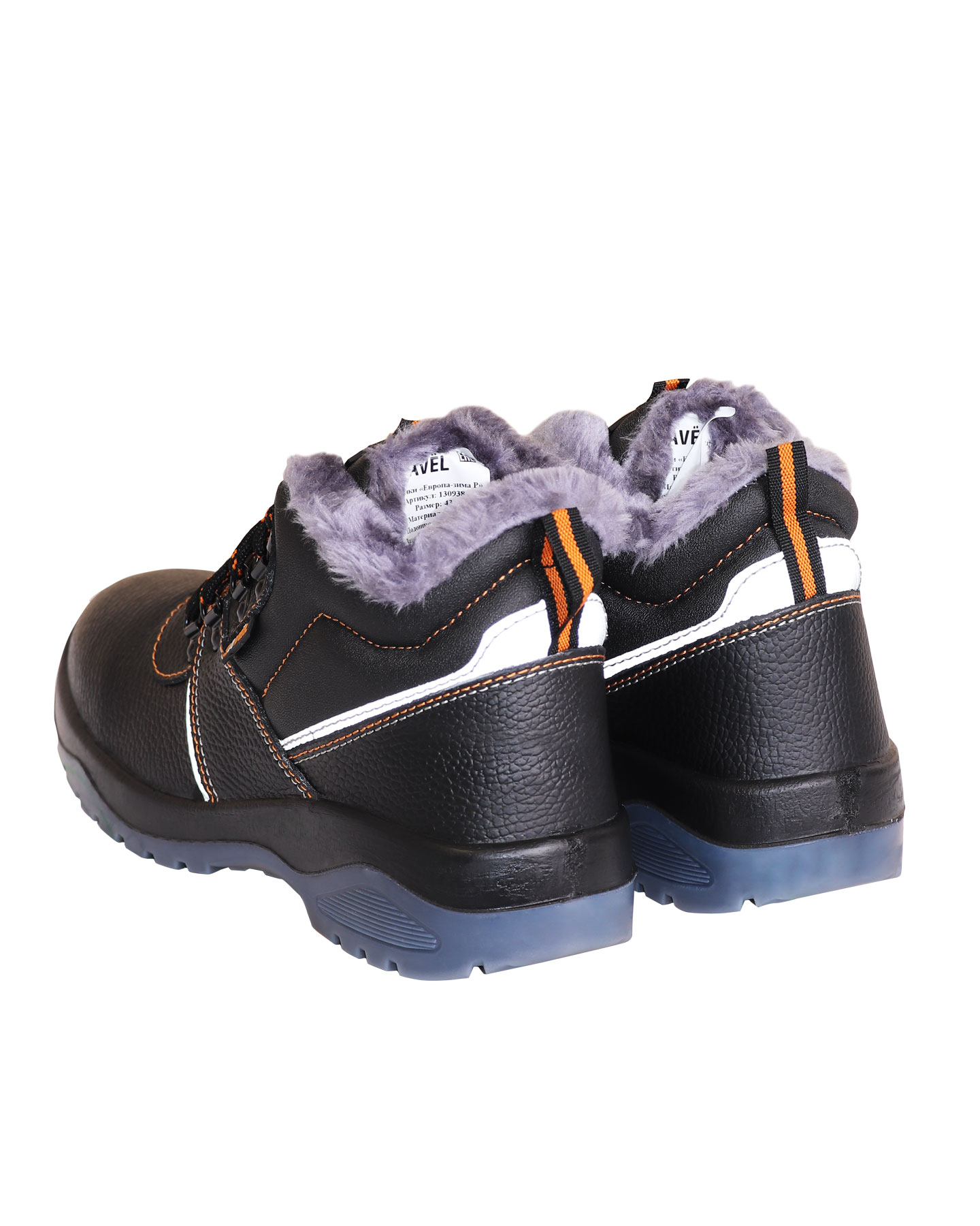 Подклад в утеплённых ботинках серии "SAVEL-Европа" серого цвета и выполнен из искусственного меха. Верх ботинка имеет контрастные отделочно-скрепляющие строчки оранжевого цвета.
