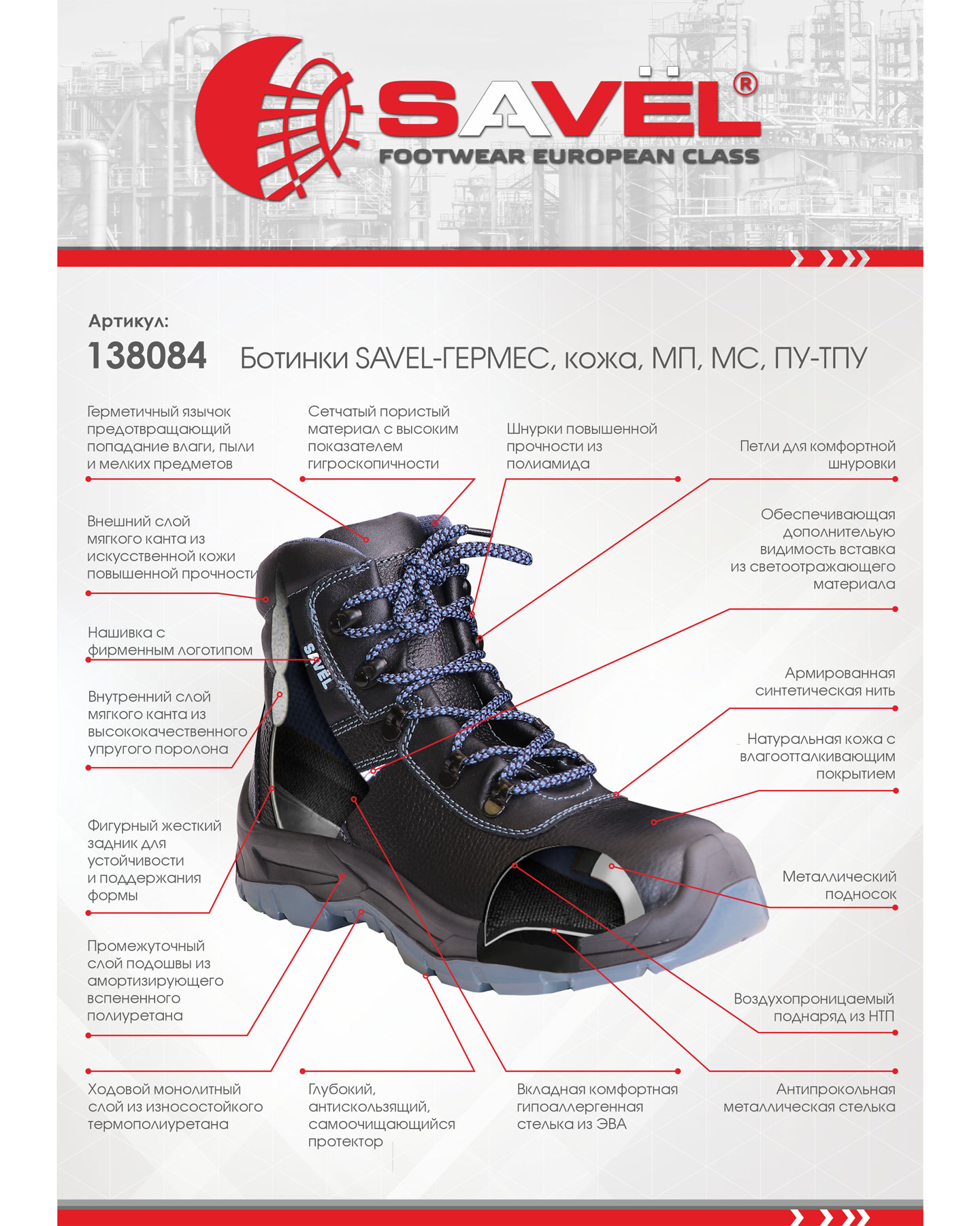 Обувь серии "SAVEL-ГЕРМЕС" предназначена для работы в нефтегазовой, горнодобывающей, энергетической, химической промышленности, на транспорте, в агропромышленном комплексе и сервисных службах.