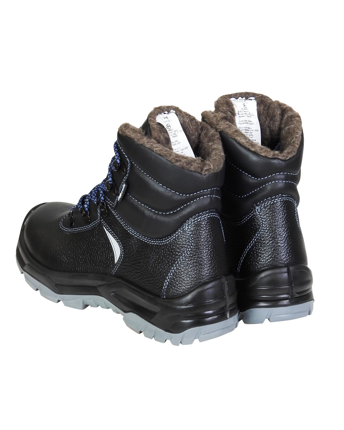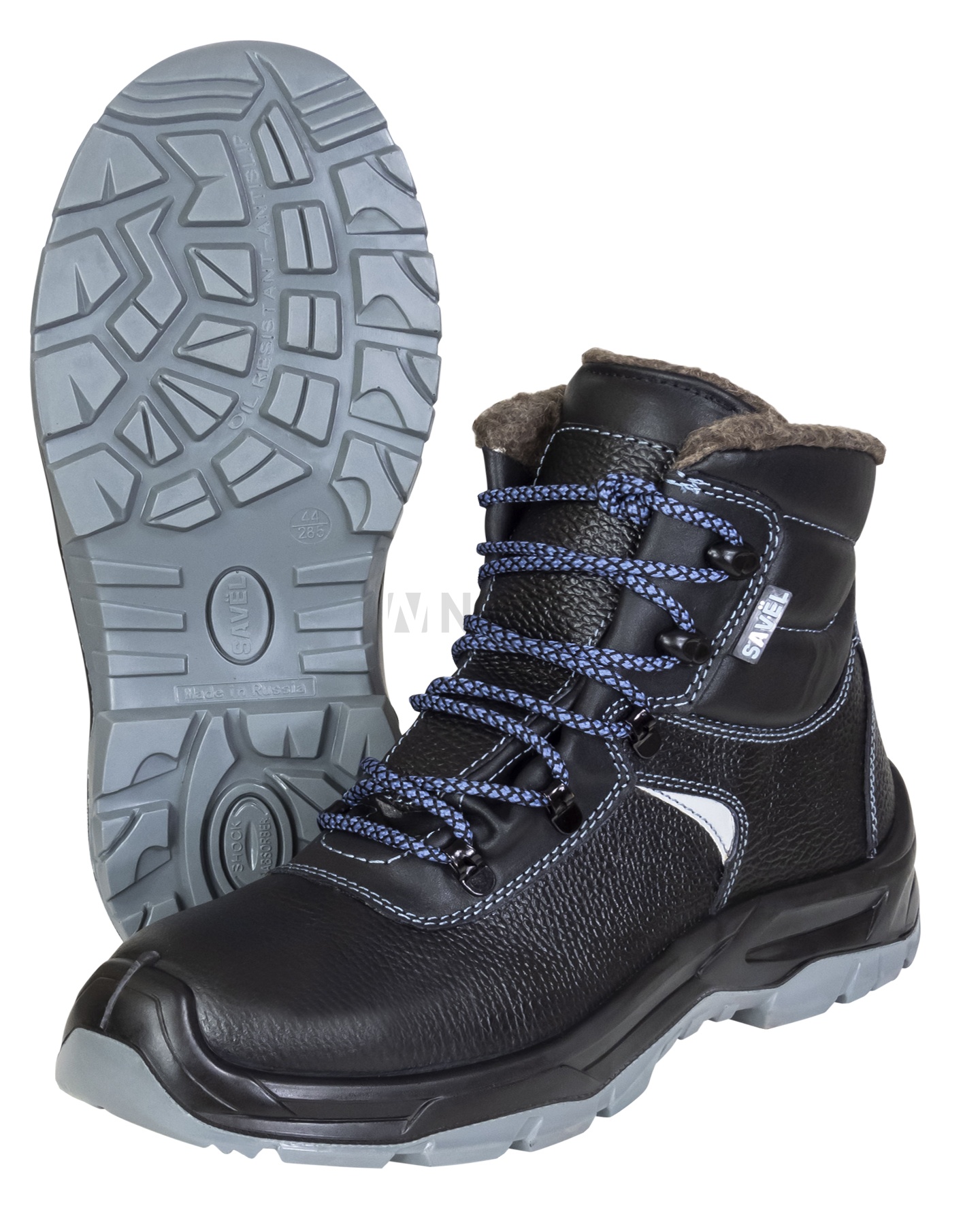 Подкладка и вкладная стелька в ботинках серии "SAVЁL-ГЕРМЕС" утеплённые, из шерстина. Для устранения натирания пятки и стирания ворсисто-волокнистого покрытия утеплителя в изнаночной зоне обувной пятки вшит внутренний мягкий задник из натуральной кожи. Имеются световозвращающие элементы для привлечения внимания и исключения несчастных случаев на производстве в темное время суток.