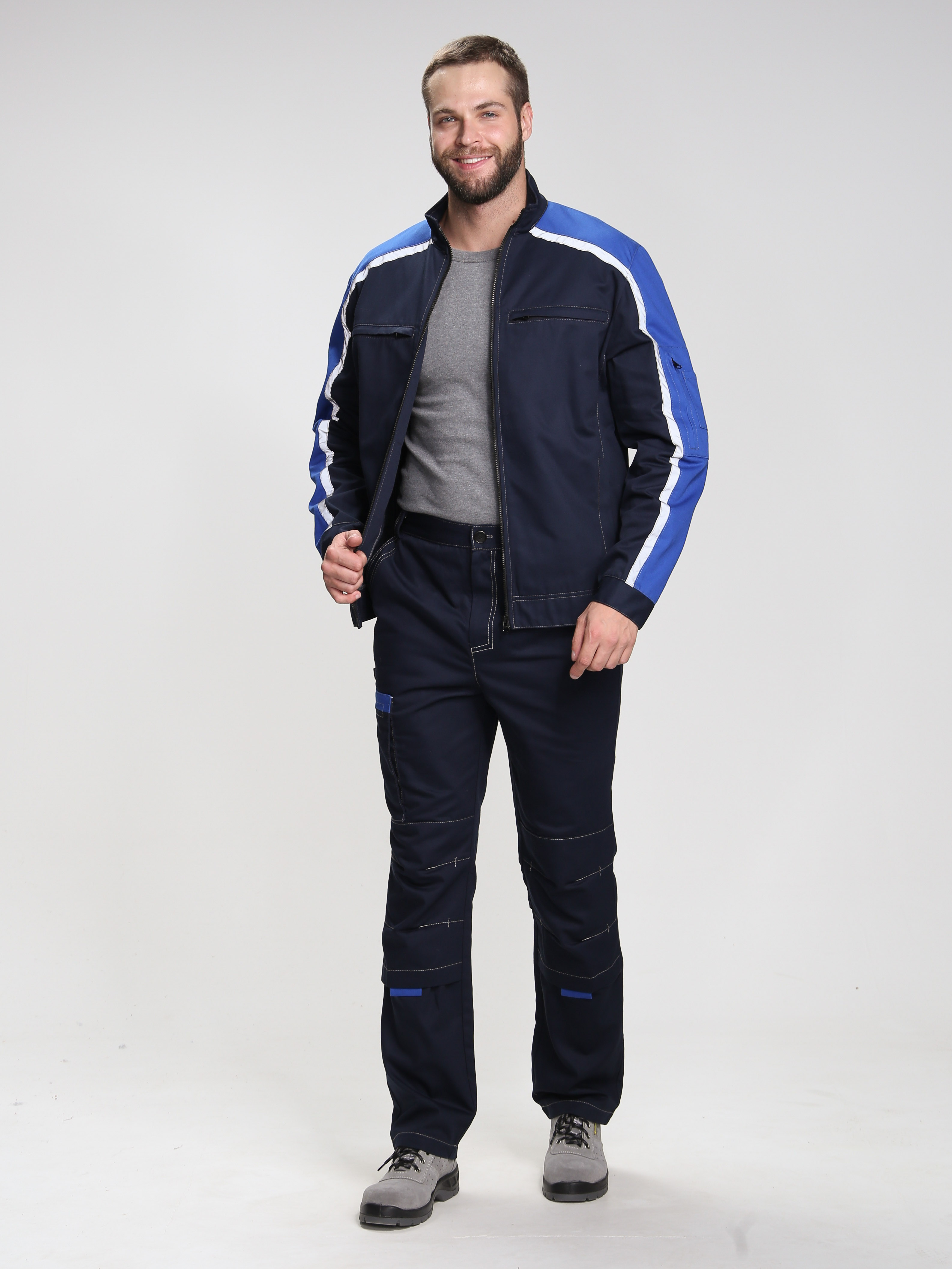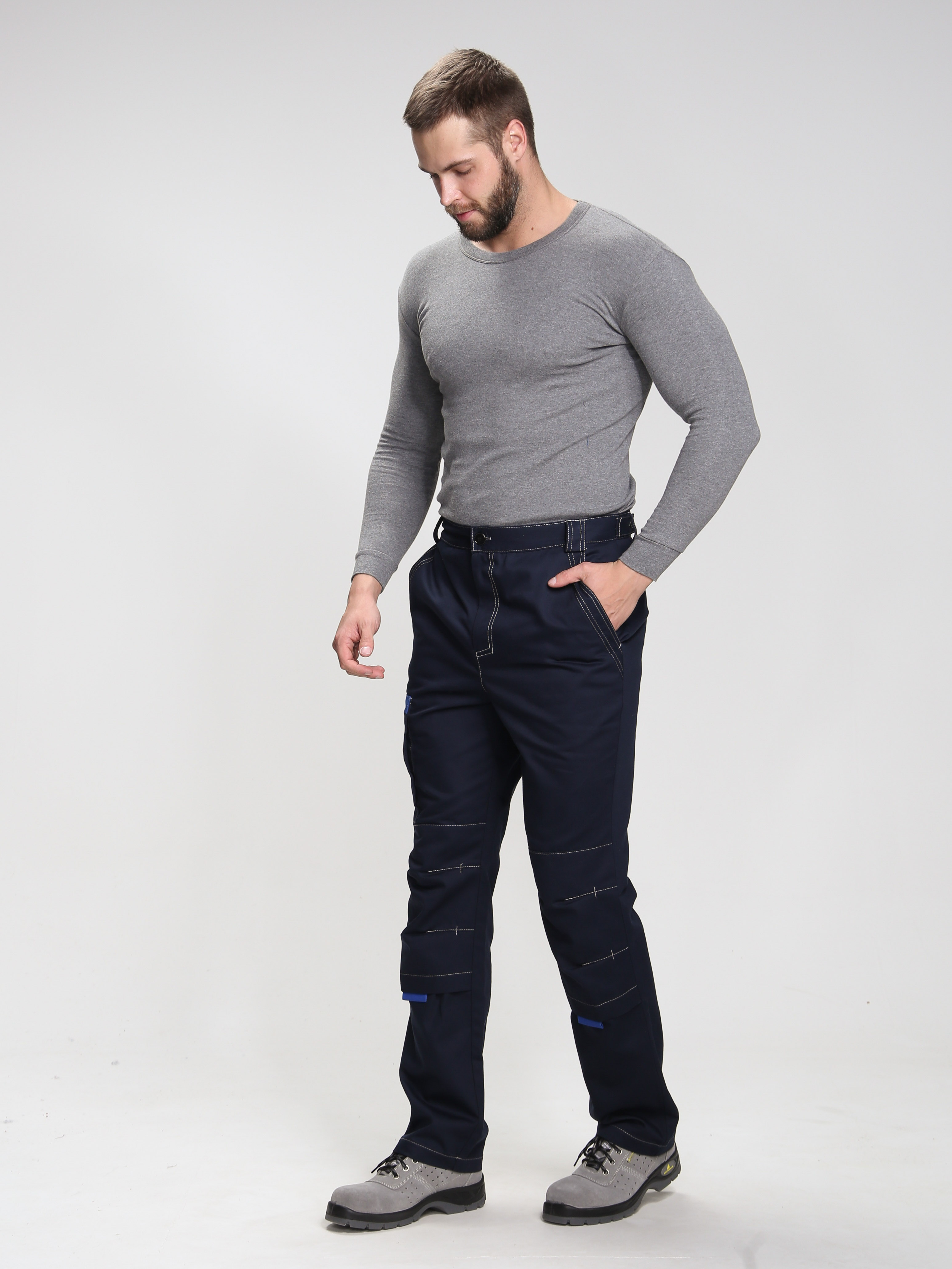 - на уровне колена настрочены усиливающие накладки с четырьмя застроченными вытачками