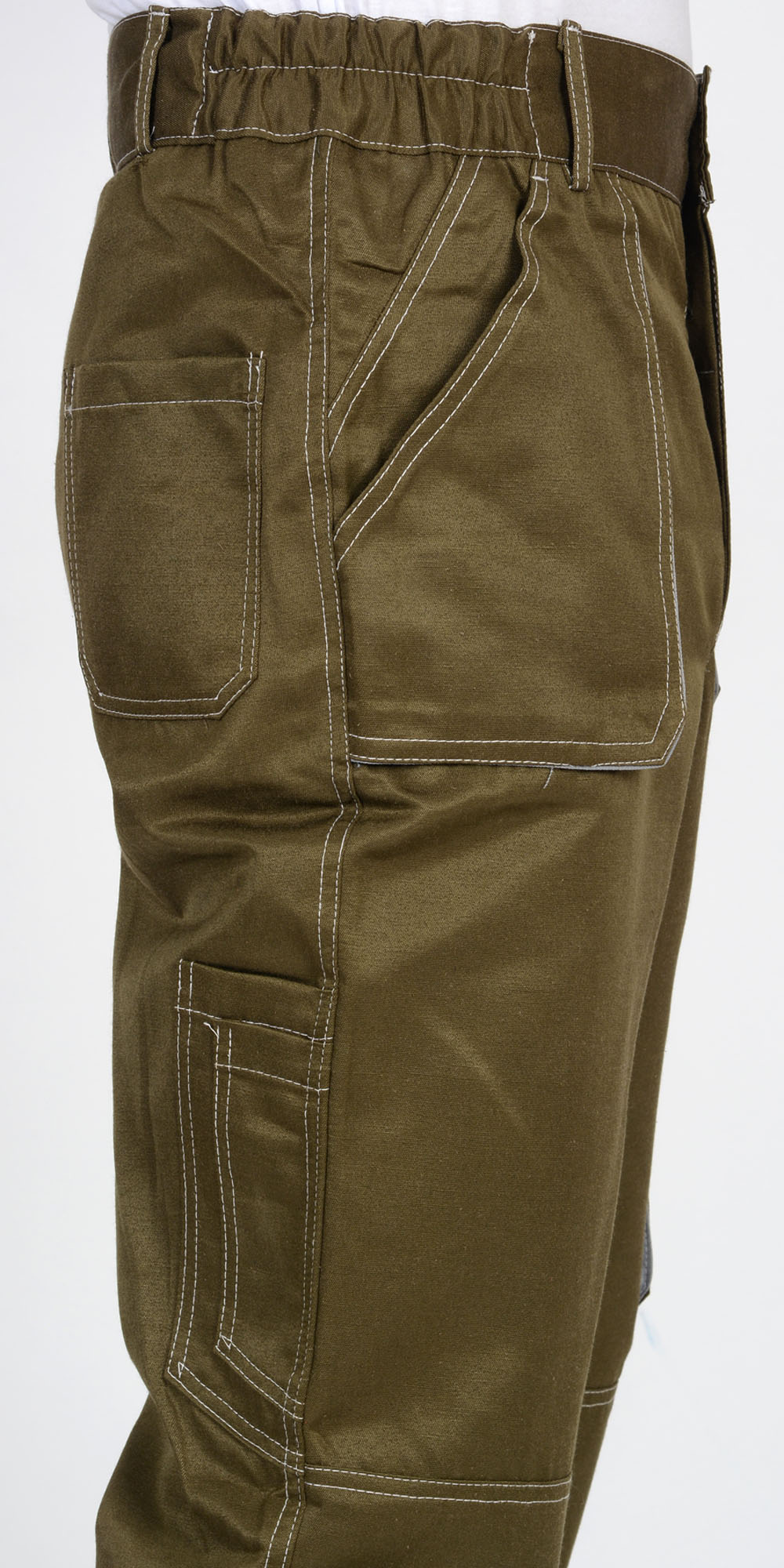 Брюки прямого силуэта, с притачным поясом, частично стянутым резинкой (по бокам) и застегивающимся на пуговицу, с гульфиком застегивающийся на пуговицы, с разными многофункциональными карманами ; с усилительными накладками. Швы отстрочены нитками контрастного цвета.