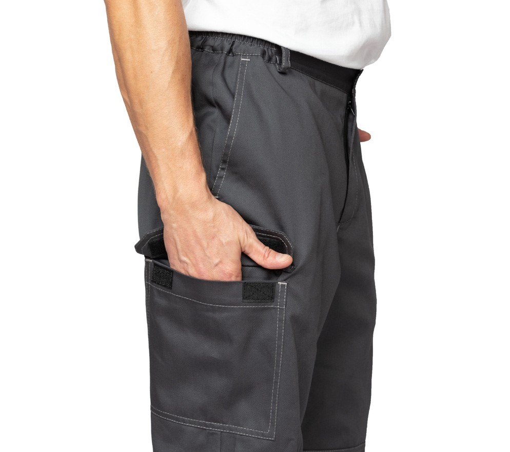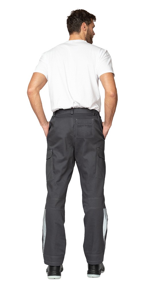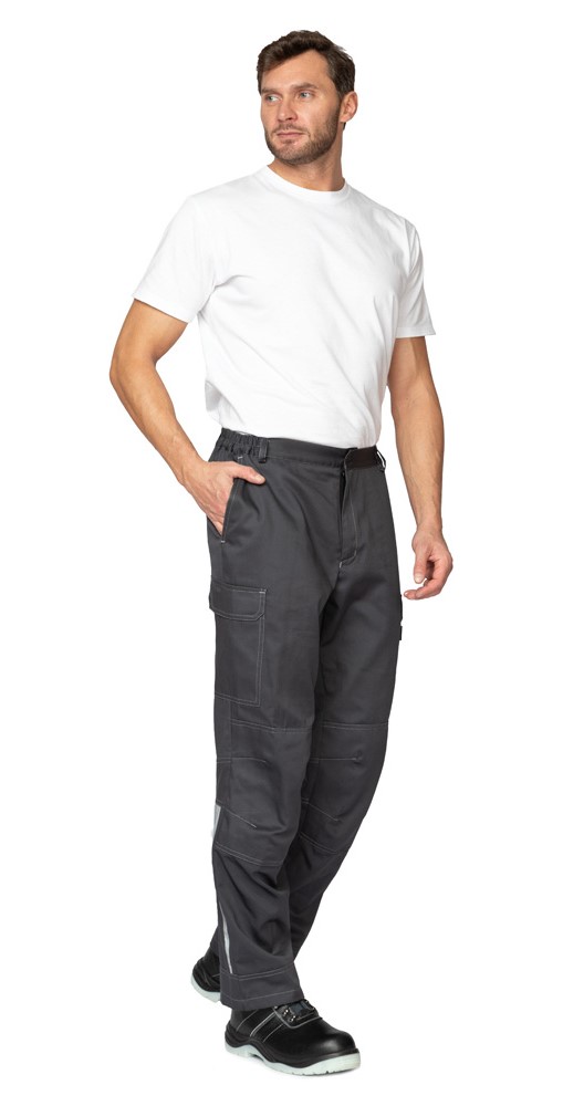 Брюки мужские летние "Эко-Труд" — классические рабочие брюки улучшенной конструкции из ткани премиального качества с повышенным содержанием хлопка. Специальная водоотталкивающая пропитка придает изделию дополнительные эксплуатационные характеристики. Рабочие брюки выполнены в универсальном цвете и станут идеальным решением для работы в летний период. Светоотражающие элементы обеспечат дополнительную защиту в условиях плохой видимости. Анатомический крой не стесняет движений и обеспечивает комфортное сгибание коленей. Область колена усилена вторым слоем ткани, общая плотность составляет 380 г/м², что гарантирует высокую степень защиты коленного сустава, а также обеспечивает высокое сопротивление на разрыв и стойкость к истиранию. Усиление по низу брюк вторым слоем ткани шириной 70 мм также препятствует истиранию, и является хорошей защитой от случайных порезов об острые предметы или детали обуви.