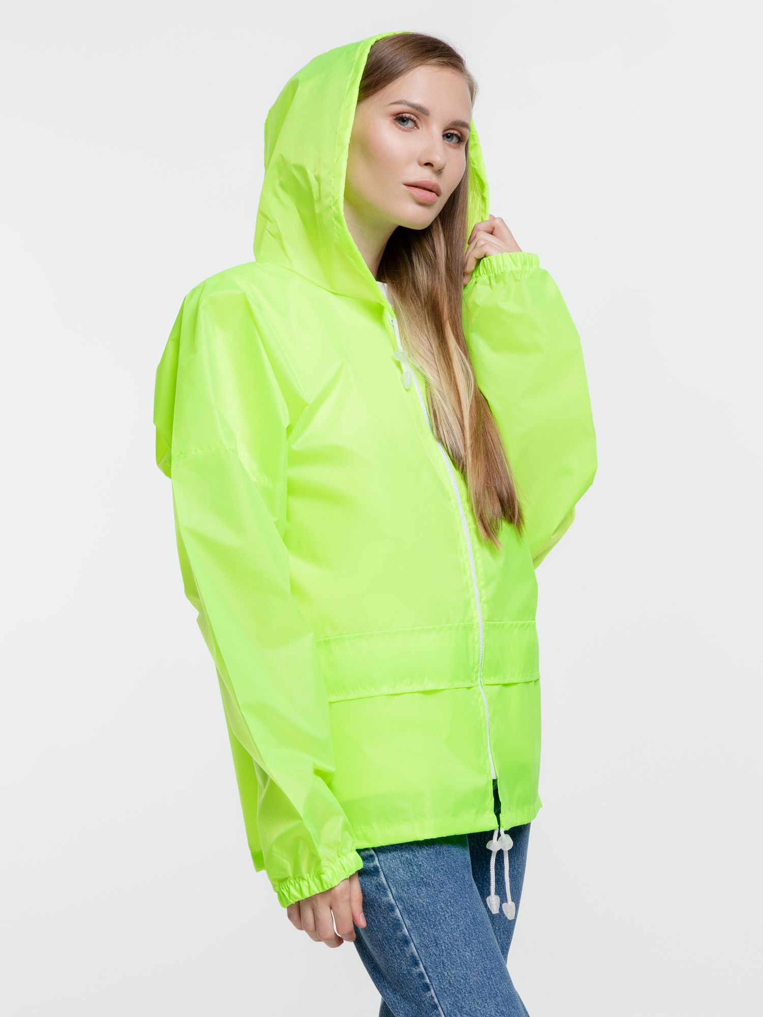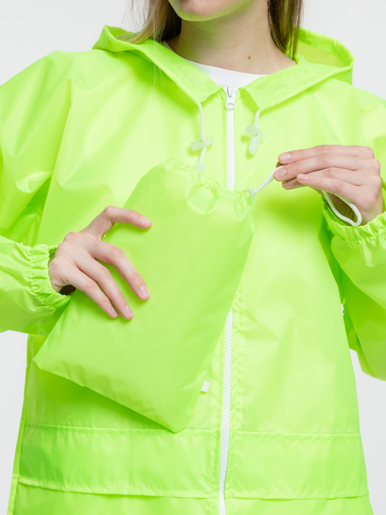 Укороченный дождевик свободного кроя из ткани таффета с влагозащитным покрытием. Складывается в мешочек — удобно брать с собой.