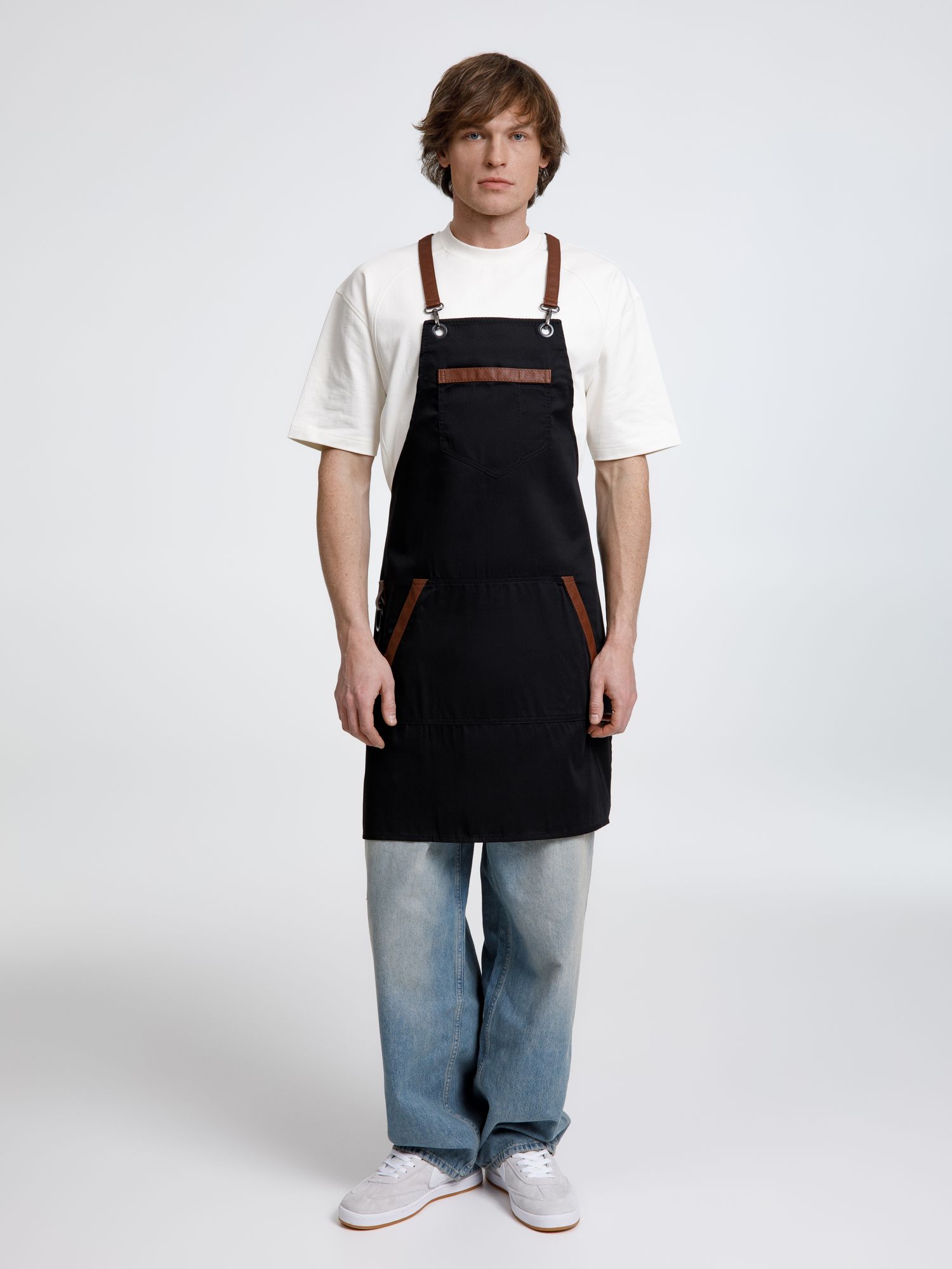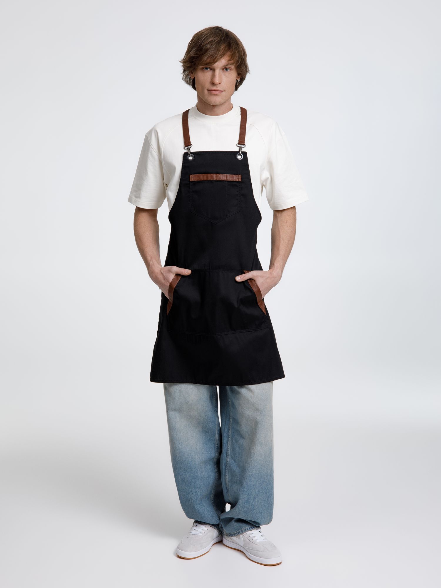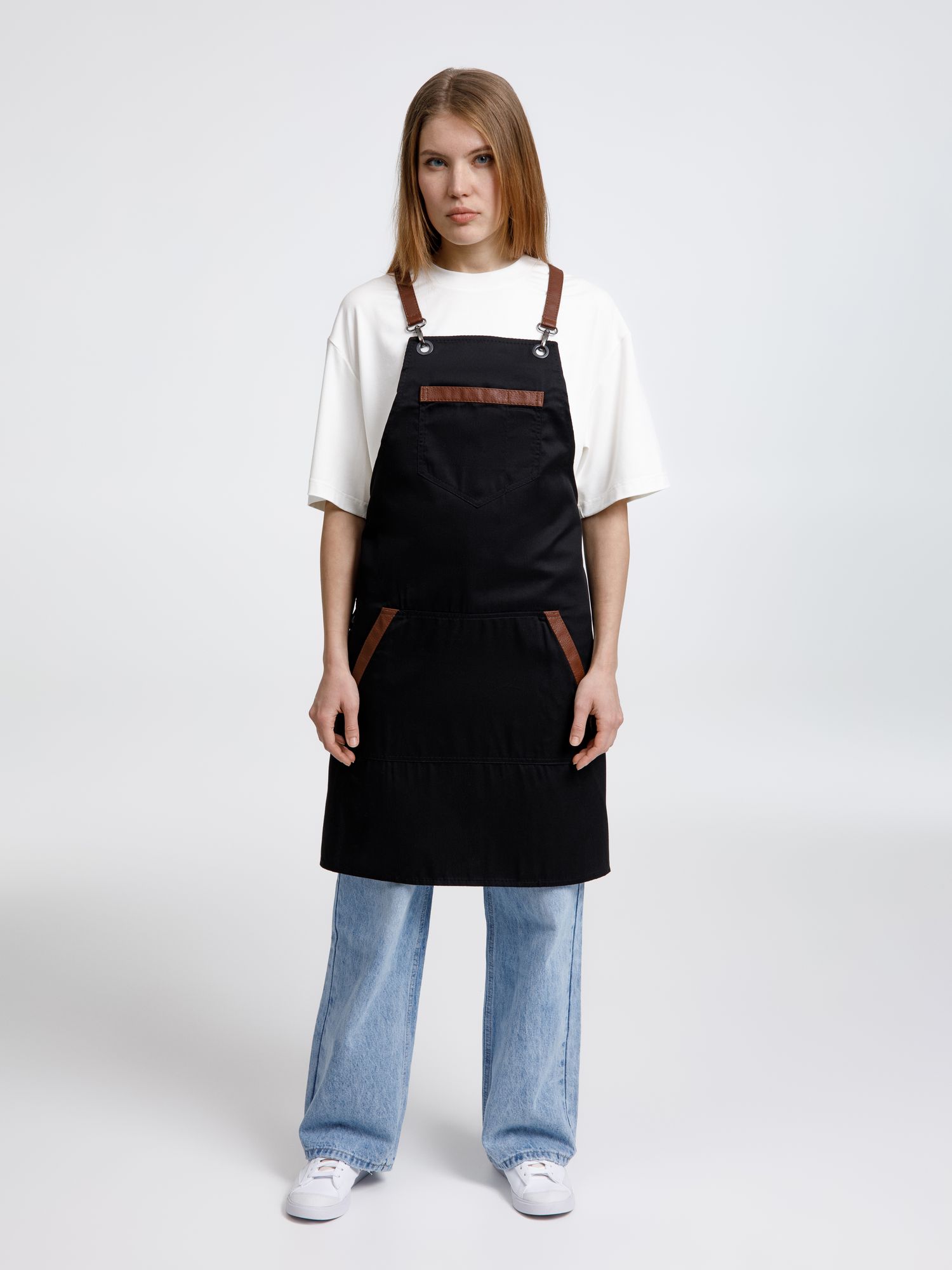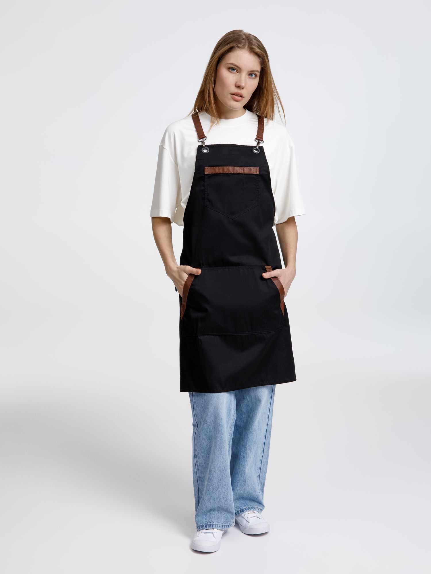 Функциональные карманы на груди и подоле эффектно украшают фартук, изготовленный из качественной дышащей плотной износостойкой ткани. Благодаря динамичным крестообразным лямкам он отлично сидит как на мужской, так и на женской фигуре. Кроме того, съемные лямки упрощают процесс стирки в стиральной машине.
