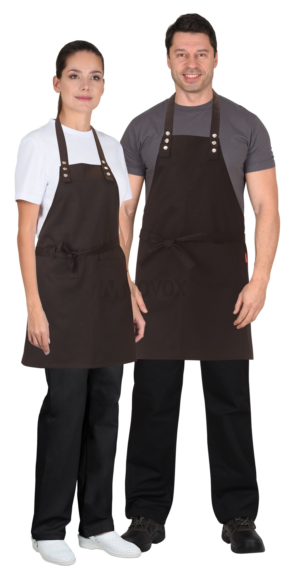 Фартук с нагрудником и с боковыми завязками для регулировки объема. Съёмная шейная бретель, пристёгивающаяся на кнопки. В нижней левой части накладной карман. На правой стороне фартука, на уровне притачивания боковых завязок, шлёвка.