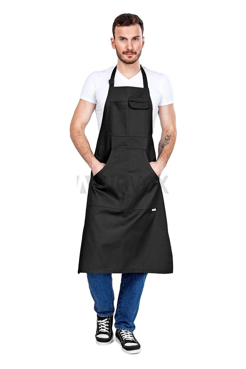 Фартук с цельнокройным нагрудником и регулируемой шейной бретелью. Длина бретели регулируется при помощи пряжки.