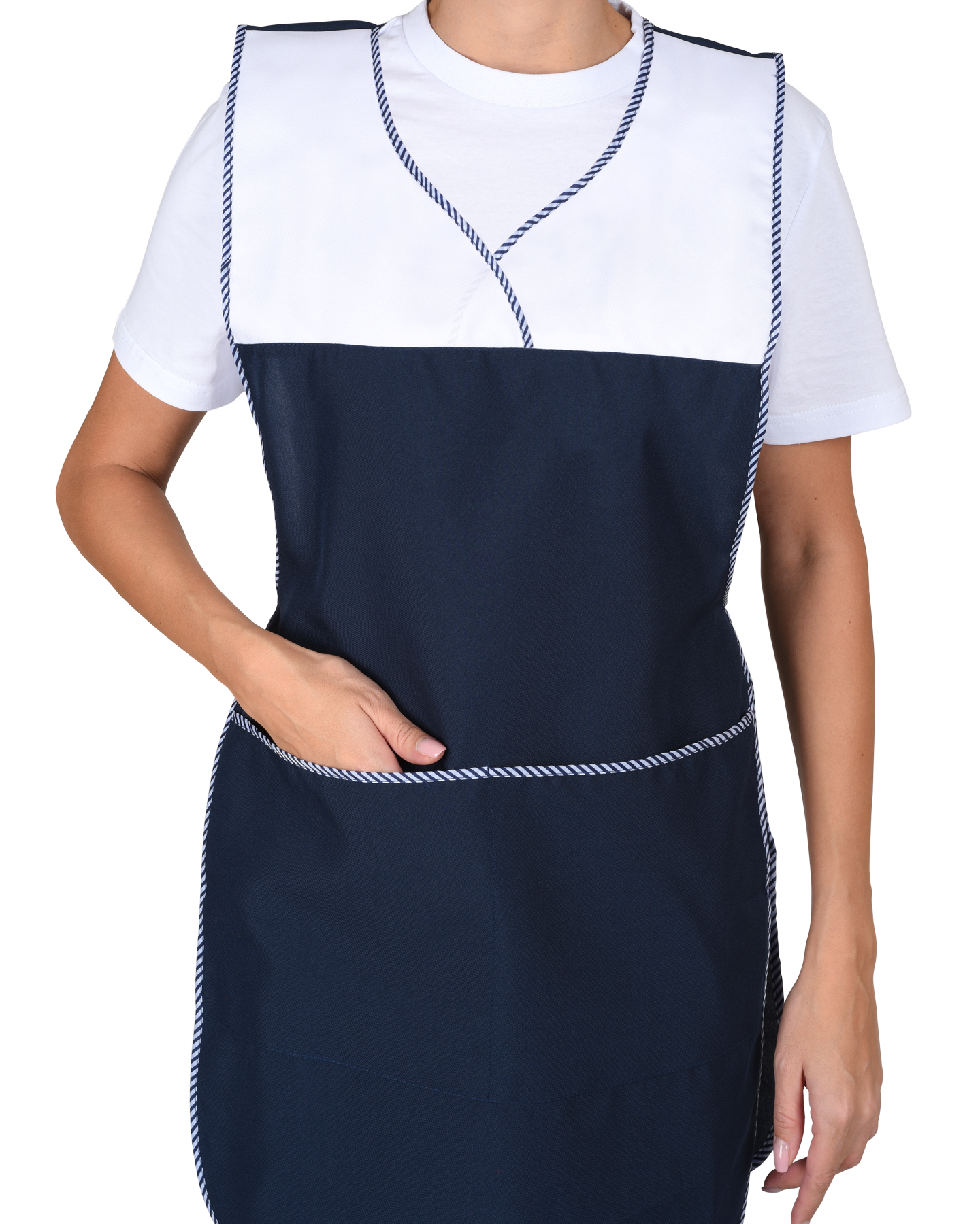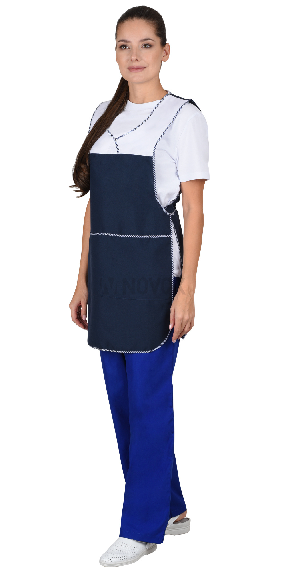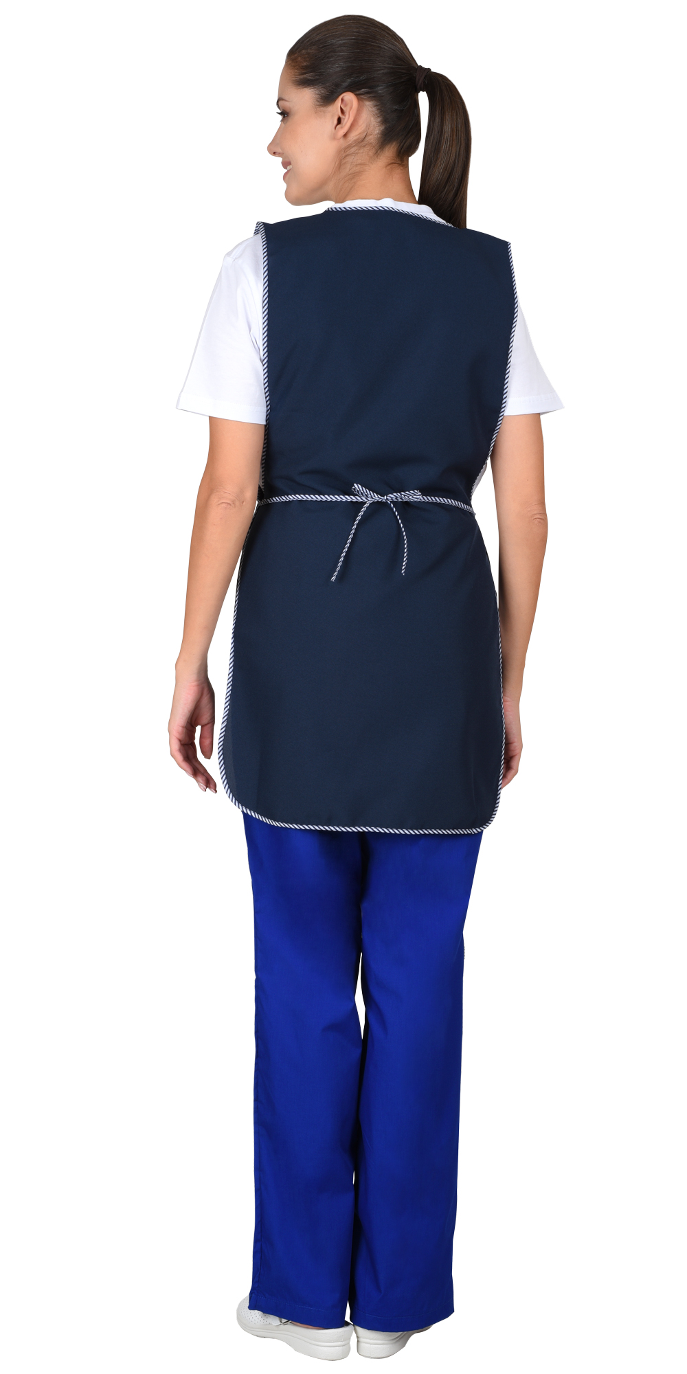 Фартук с боковыми завязками для регулировки объема, с большим накладным карманом с зональным делением. Фартук по горловине, верхнему срезу кармана и края окантован окантовочной лентой из отделочной ткани.
