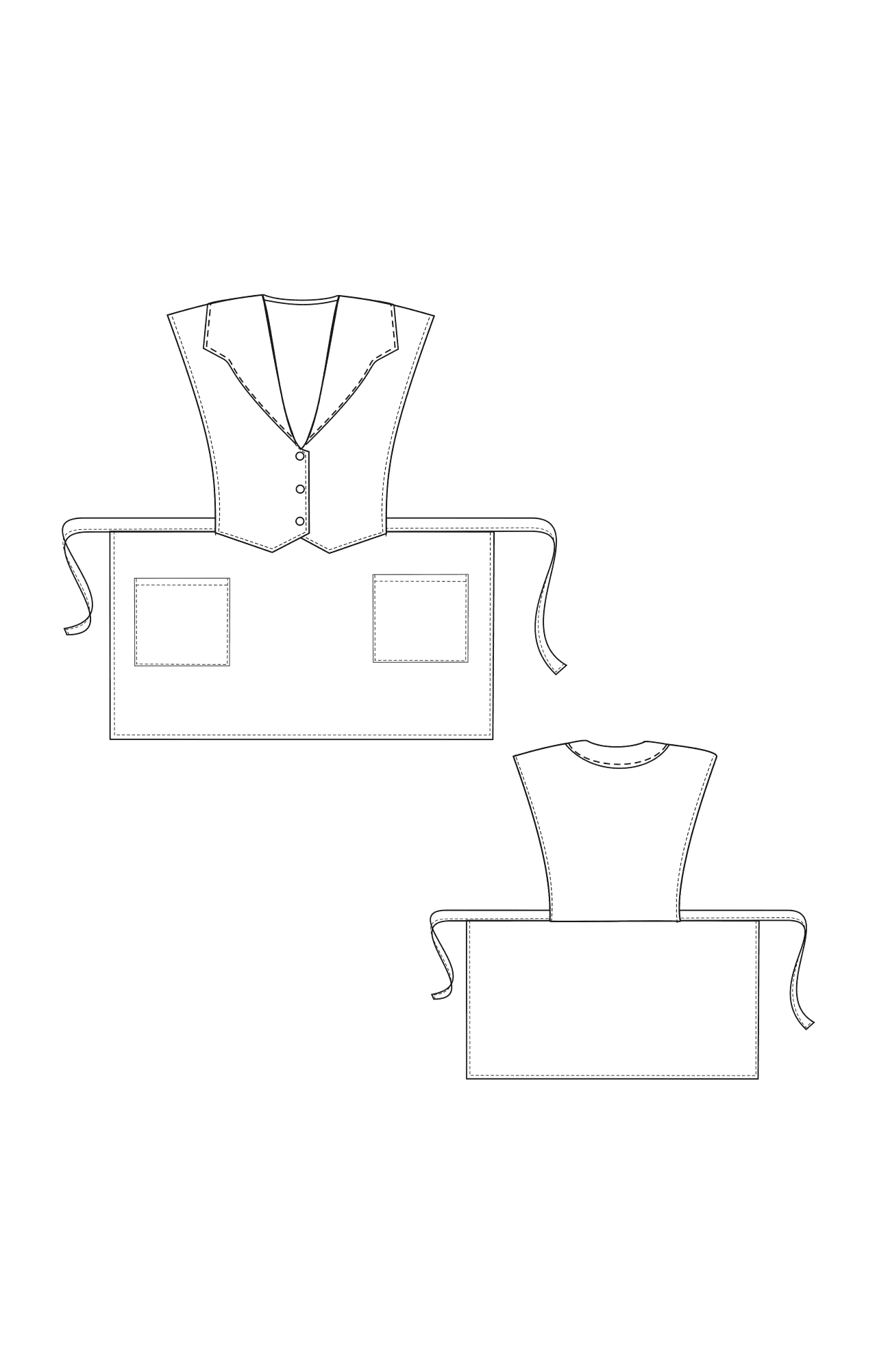 - Передняя сторона выполнена из материала отделки. Имеет вид жилета со строчкой посередине, соединенного с юбкой. Декорирована тремя пуговицами.