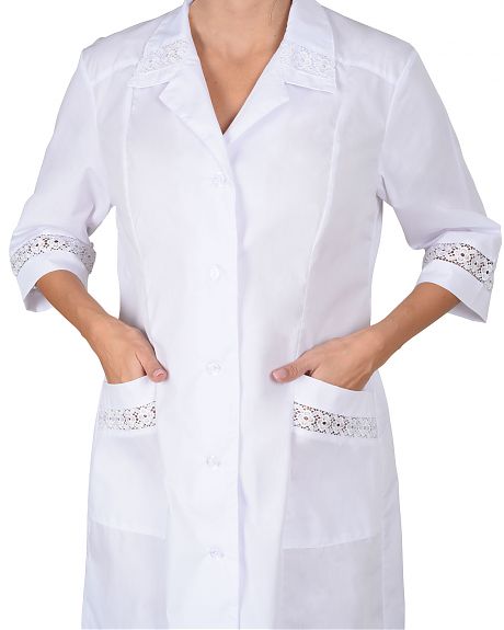 Халат полуприлегающего силуэта, с центральной застёжкой на 5 петель и пуговицы, с отложным воротником, с нижними накладными карманами с фигурными планками. Рукава 3/4. Воротник, карманы, рукава с отделкой кружевом. По талии халат регулируется поясом