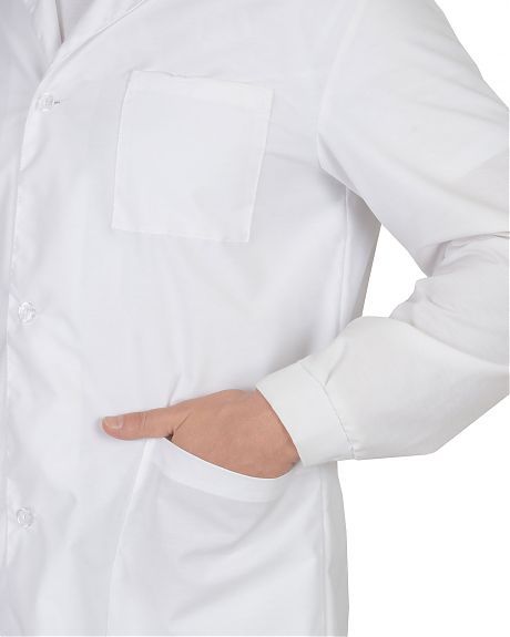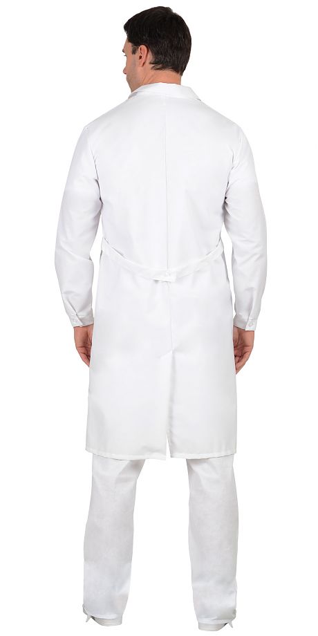 Тк. бязь, 100% х/б. Отложной воротник, застёжка на пуговицы, два кармана. Манжеты рукавов на пуговице. На спинке - хлястик. ГОСТ 12.4132-83.