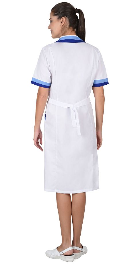 Халат с двумя нижними накладными карманами, отложным воротником и короткими рукавами. Ширина по линии талии регулируется хлястиком. Воротник, рукава и карманы с яркими отделочными элементами.