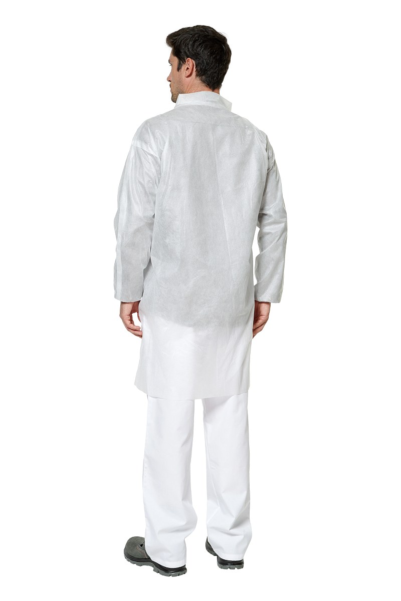 Халат одноразовый, имеет хорошую воздухопроницаемость одновременно с пылезащитными свойствами, застегивается на контактную ленту. Материал нетоксичен, не вызывает аллергических реакций, антистатичен. Разрешен к применению в медицине, фармацевтической и пищевой промышленности.