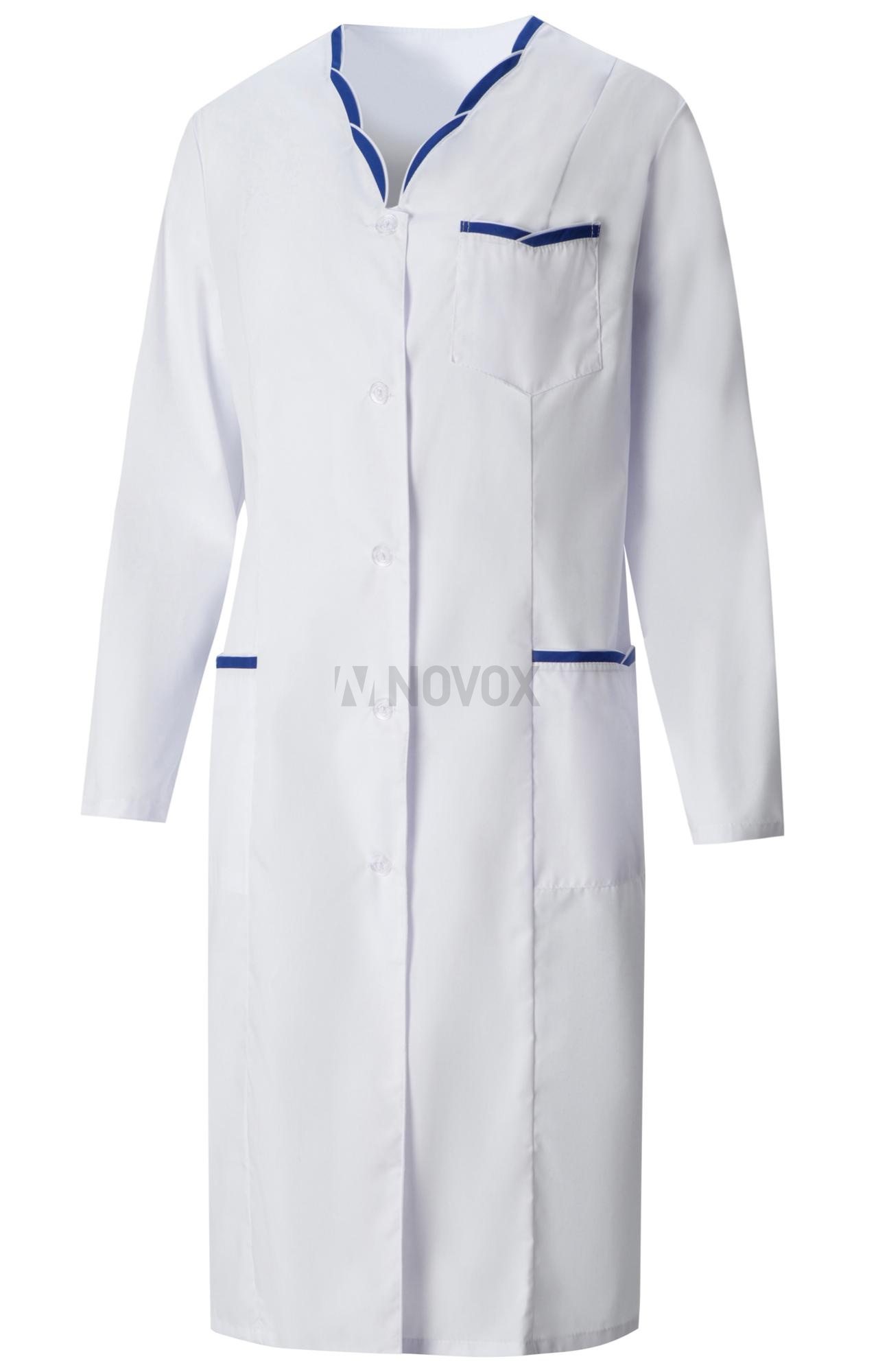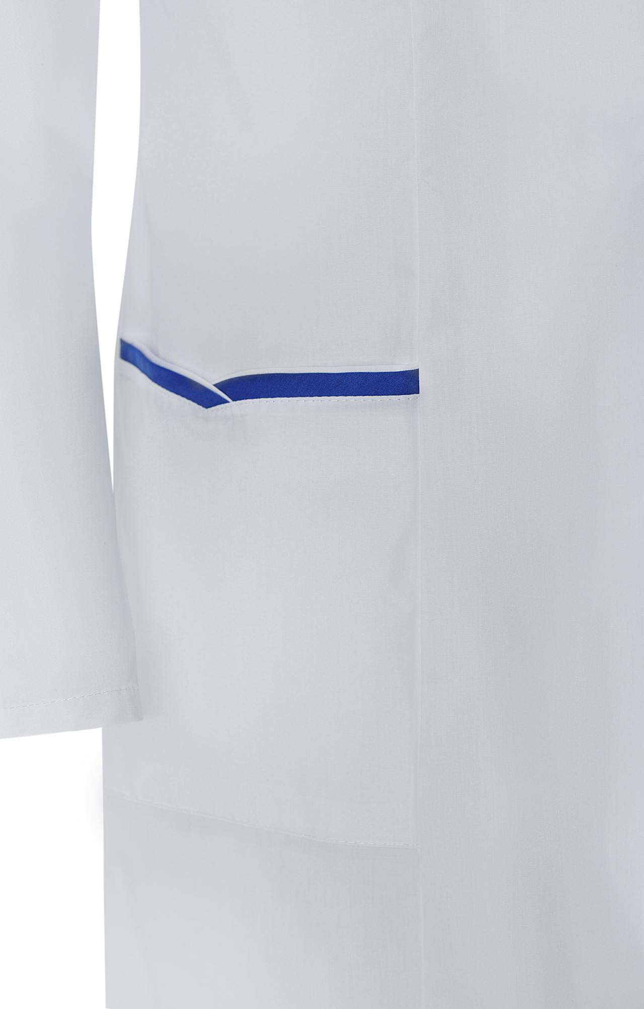 Женский медицинский халат “Ольга” белого цвета с выпускной окантовкой василькового цвета предназначен для экипировки медработников.