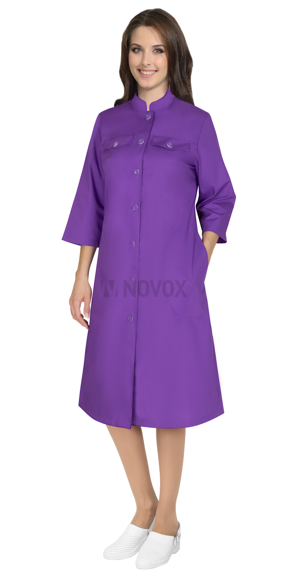 Халат женский, полуприлегающего силуэта, с втачным воротником стойка, центральной застёжкой на пуговицы, карманами в боковых швах, шлицей на спинке, втачными рукавами длиной 3/4.