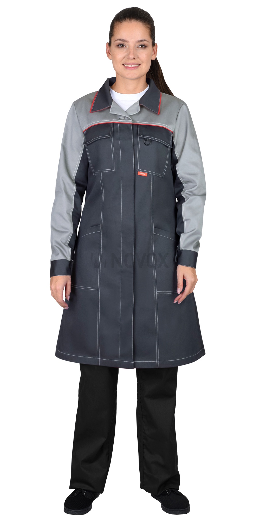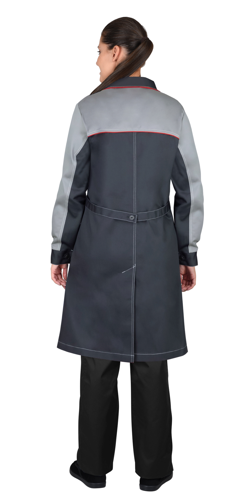 Халат женский полуприлегающего силуэта, с центральной застёжкой на пуговицы, с отложным воротником с лацканами, с втачными рукавами с манжетой на пуговице, с нагрудными и нижними накладными карманами, шлицей в среднем шве спинки, на спинке хлястик с пуговицей для регулировки объёма по талии. В халате предусмотрено крепление бейджа.