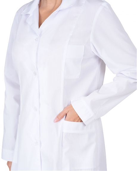 Классическая модель с нагрудным и двумя нижними накладными карманами, отложным воротником и длинными рукавами с манжетами. Ширина халата по линии талии регулируется хлястиком.
