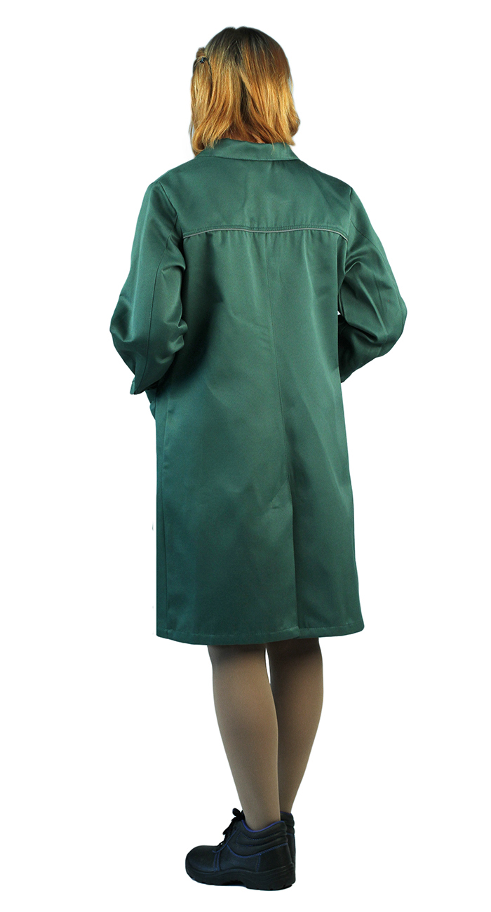 Халат с центральной застежкой на пуговицы, с длинными рукавами с манжетами, на спинке шлица.
