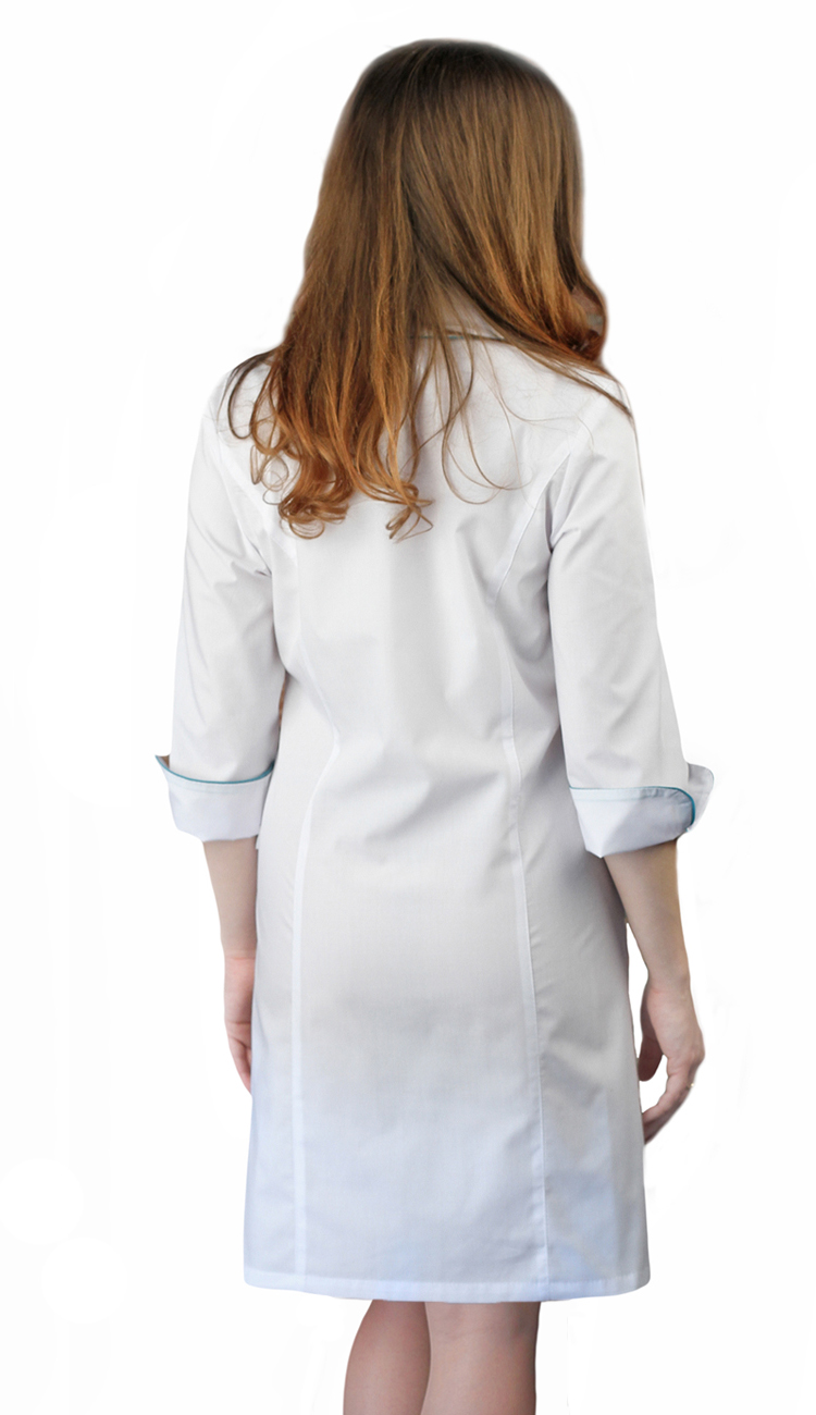 Халат прилегающего силуэта с центральной застежкой на пуговицы, с вертикальными рельфами, с фигурными карманами, с втачными рукавами 3/4. Карманы, воротник и манжеты с контрастной отделкой.