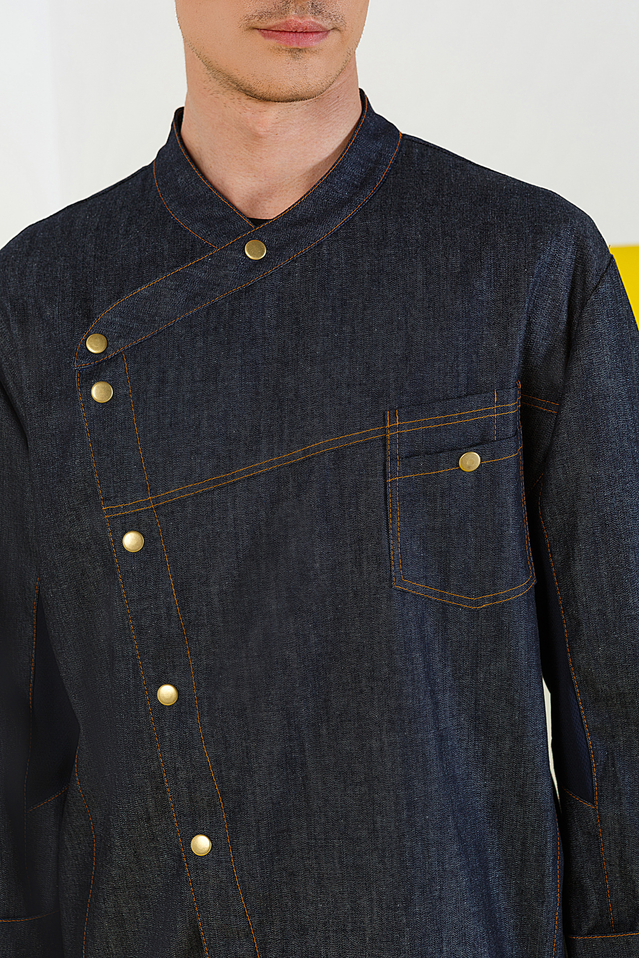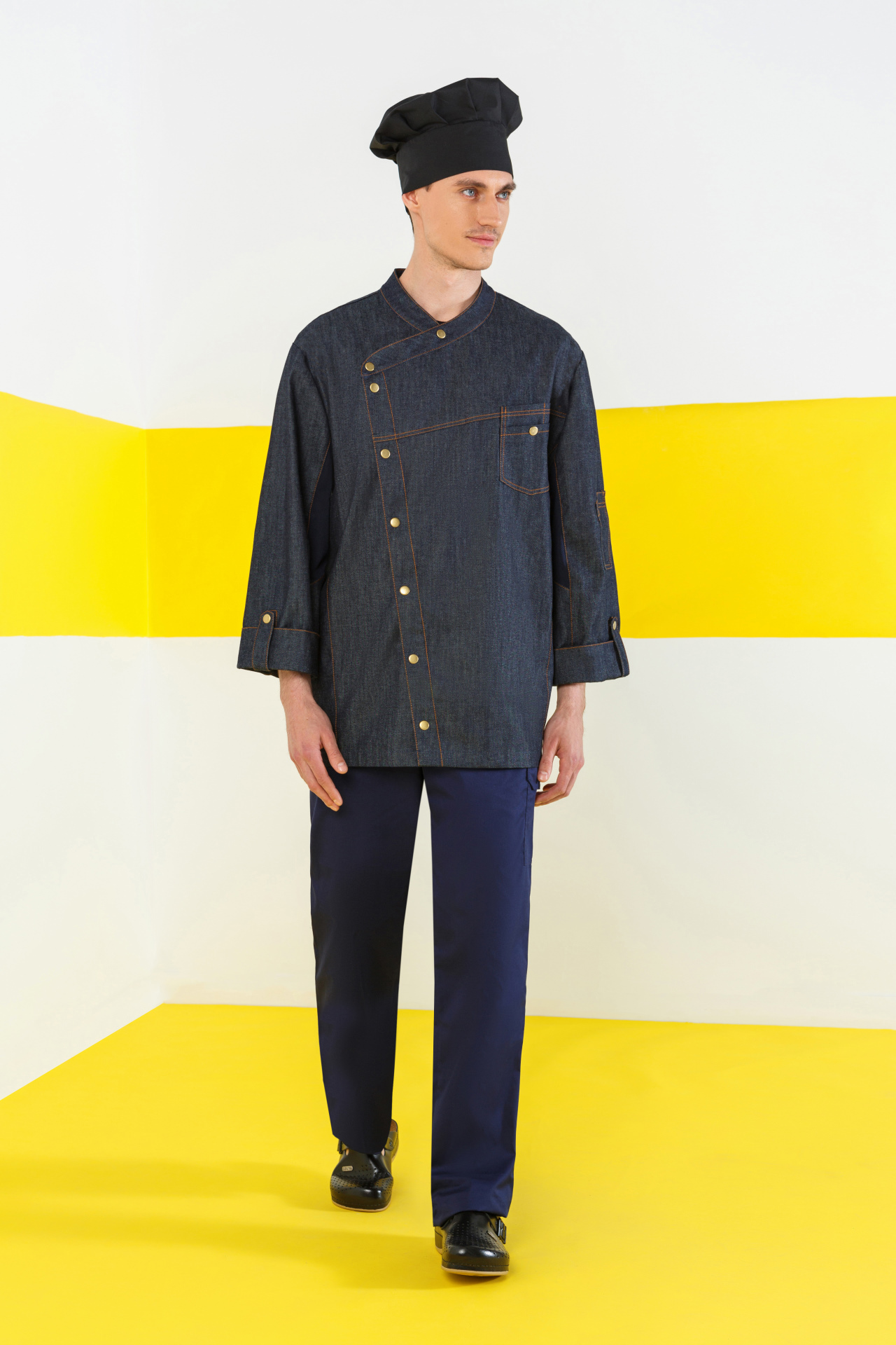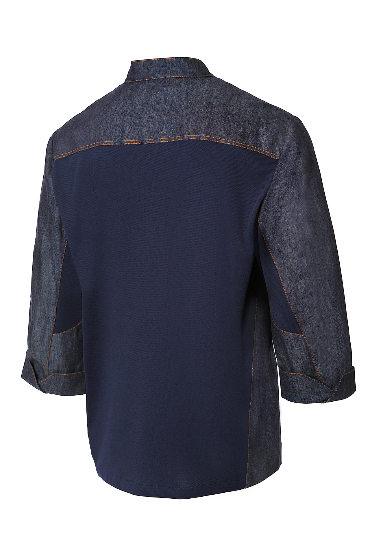 Мужской поварской китель из денима - дизайнерская модель с длинным рукавом, который можно подвернуть и застегнуть на кнопку. Вставки из трикотажной сетки создают идеальную посадку по фигуре, обеспечивая свободу движения и комфортные условия, особенно в помещениях с высокой температурой. Все швы отстрочены декоративной строчкой, что обеспечивает дополнительную прочность изделию.