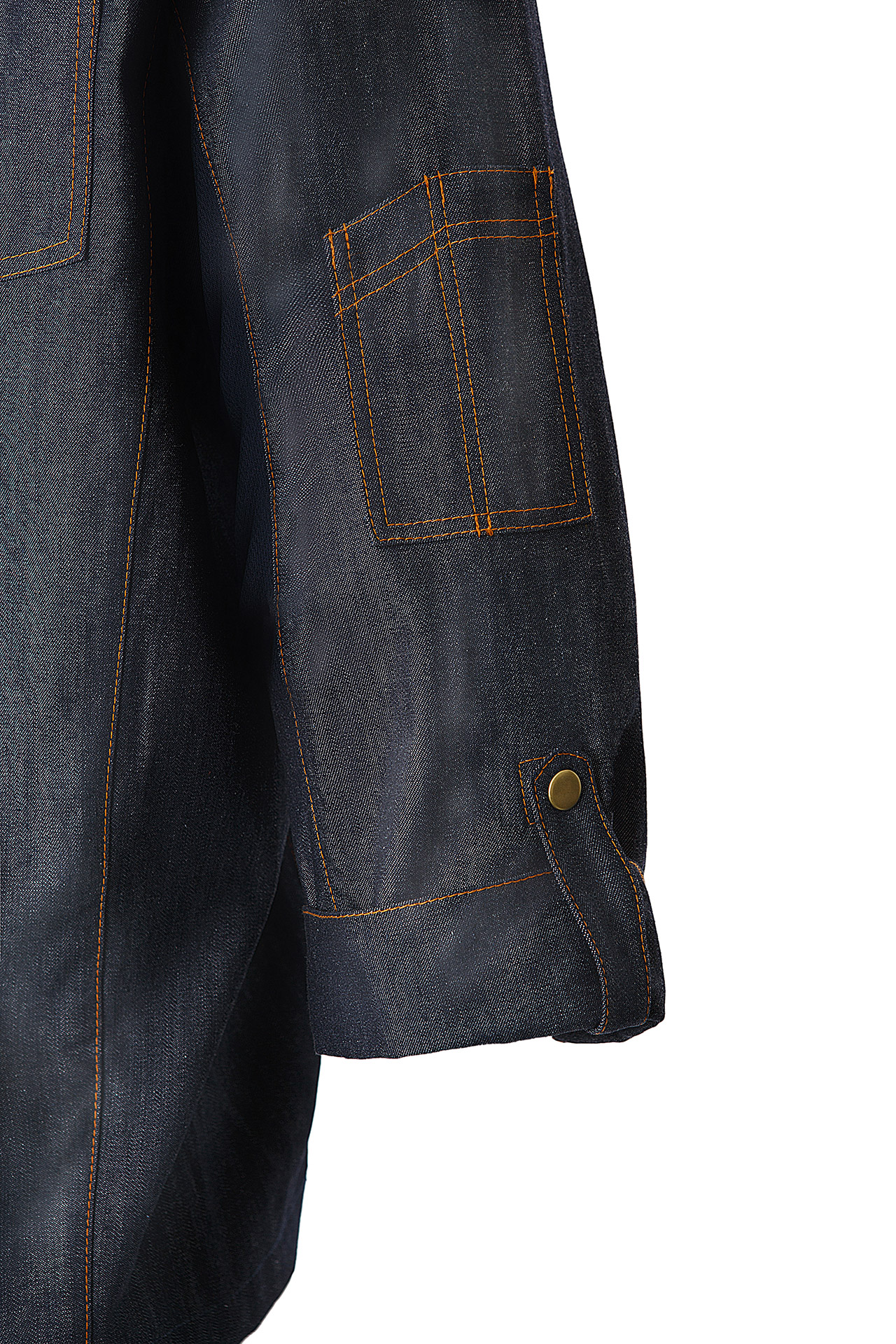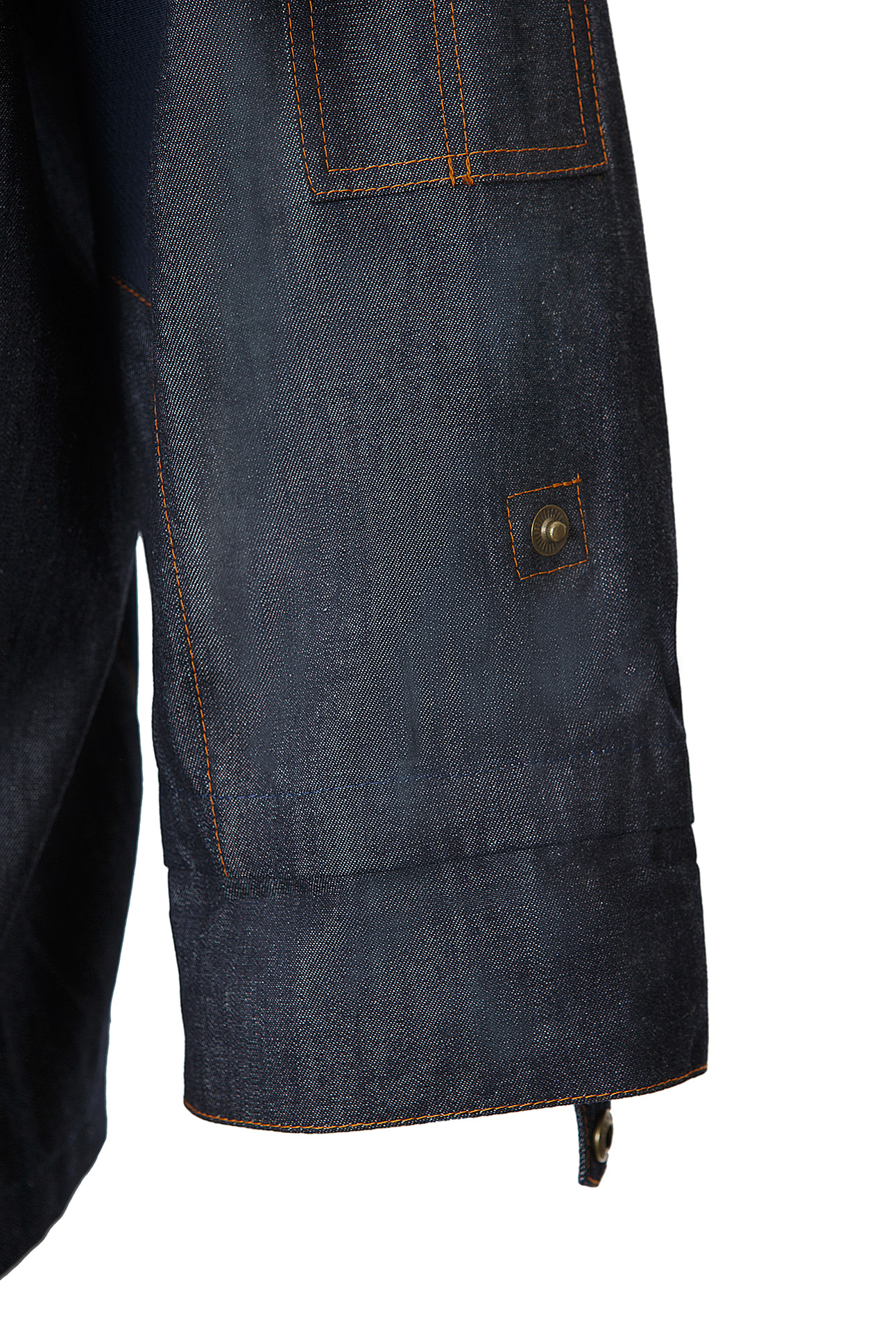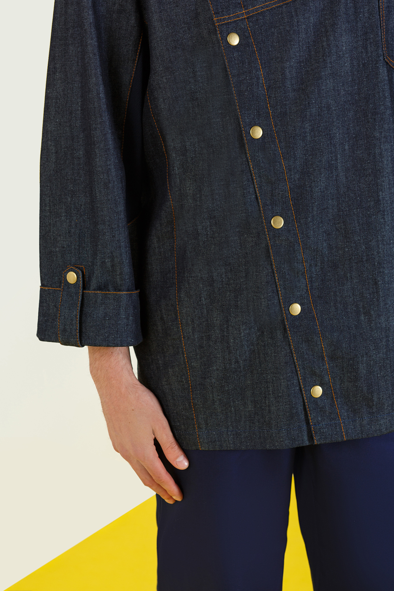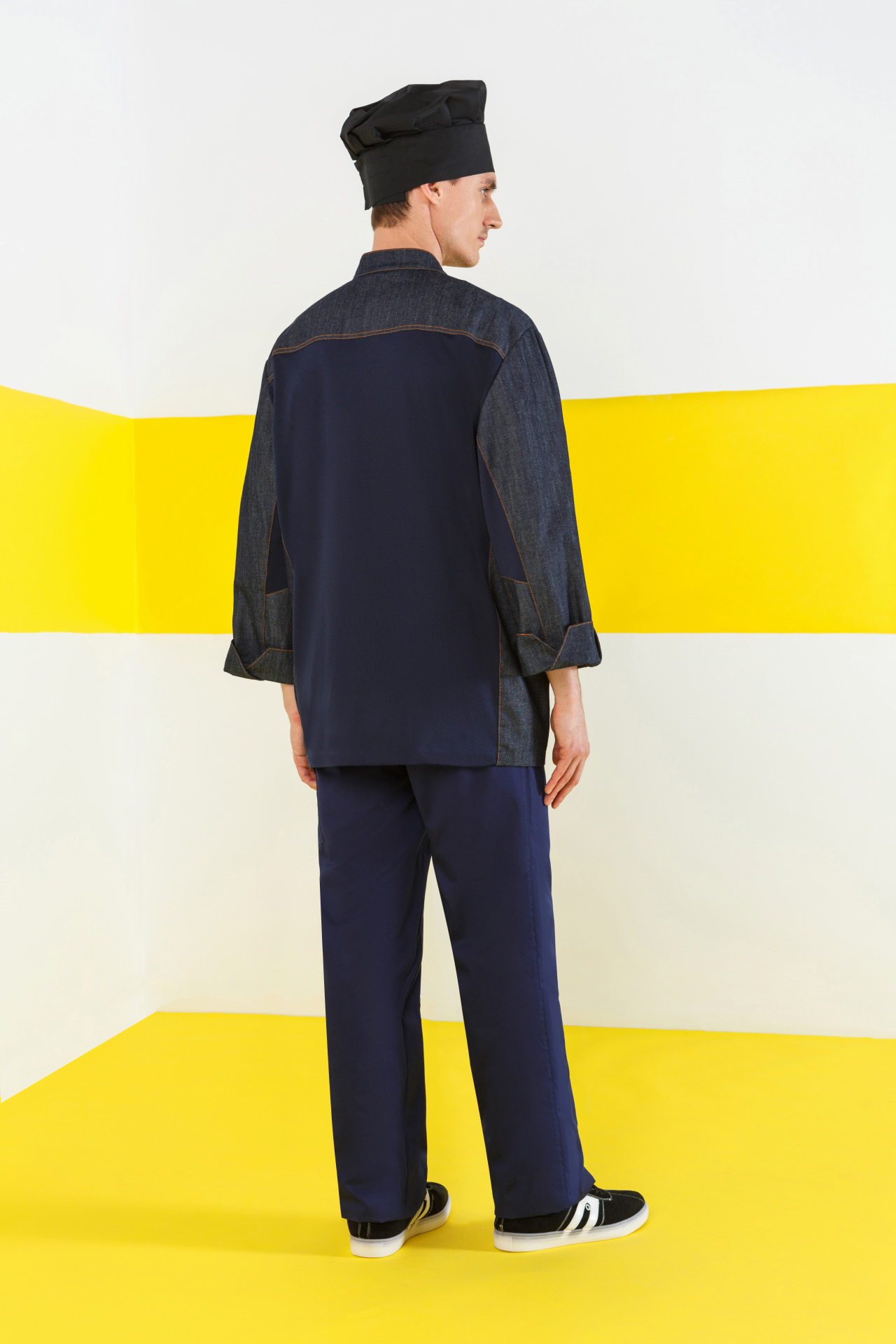 Мужской поварской китель из денима - дизайнерская модель с длинным рукавом, который можно подвернуть и застегнуть на кнопку. Вставки из трикотажной сетки создают идеальную посадку по фигуре, обеспечивая свободу движения и комфортные условия, особенно в помещениях с высокой температурой. Все швы отстрочены декоративной строчкой, что обеспечивает дополнительную прочность изделию.