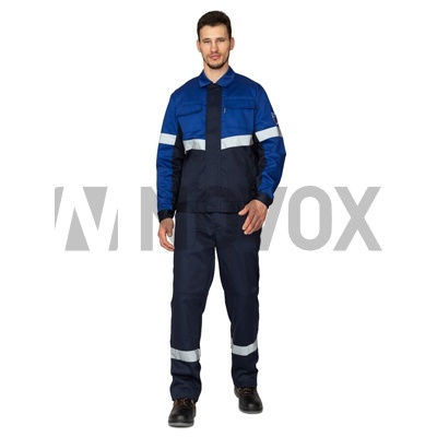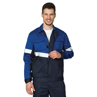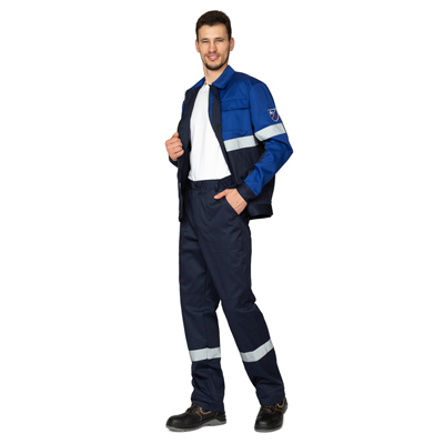 Костюм мужской «Вираж-Антистат М» — антистатический костюм в темно-синем оттенке с вставками цвета василек. Данная модель костюма предназначена для специалистов различных видов производства, где требуются защита от статического электричества: инженеры, строители, электромонтажники и другие специалисты. При его изготовлении используется высокопрочная ткань с металлизированной антистатической нитью. Материал с высоким содержанием хлопка (80%) обеспечит комфорт в работе. Специальное покрытие НМВО гарантирует устойчивость к различным видам загрязнения (нефти, масел). Спецодежда сохраняет форму и специальные свойства на протяжении долгого срока. Комплект состоит из укороченной куртки и брюк. Куртка с отложным воротником, которая застегивается спереди на молнию и имеет ветрозащитную планку. Брюки прямого кроя.