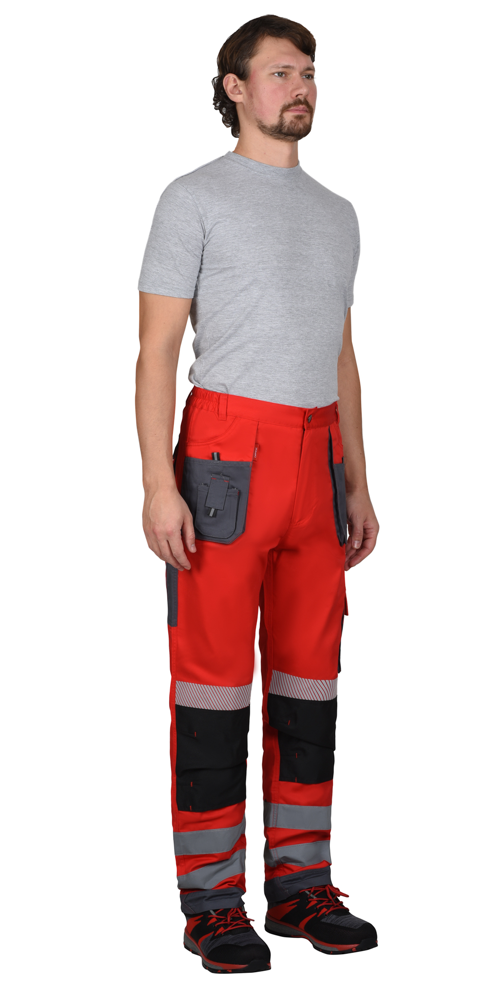 Брюки прямого кроя на поясе, с застёжкой гульфика на молнию, с накладными карманами спереди, сзади и на боковых швах. Брюки с усилительными накладками в области колен с нижним входом для амортизационного вкладыша.
