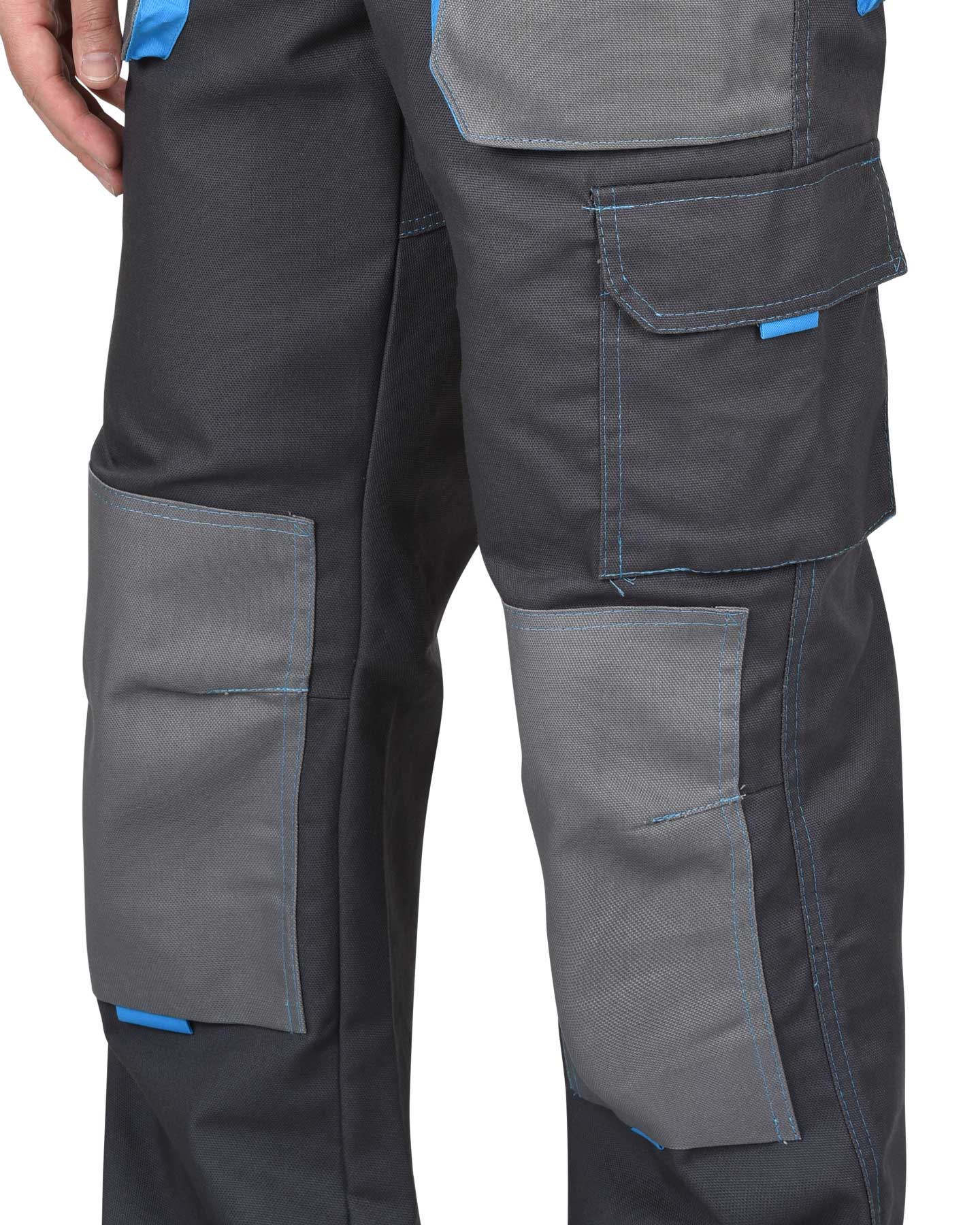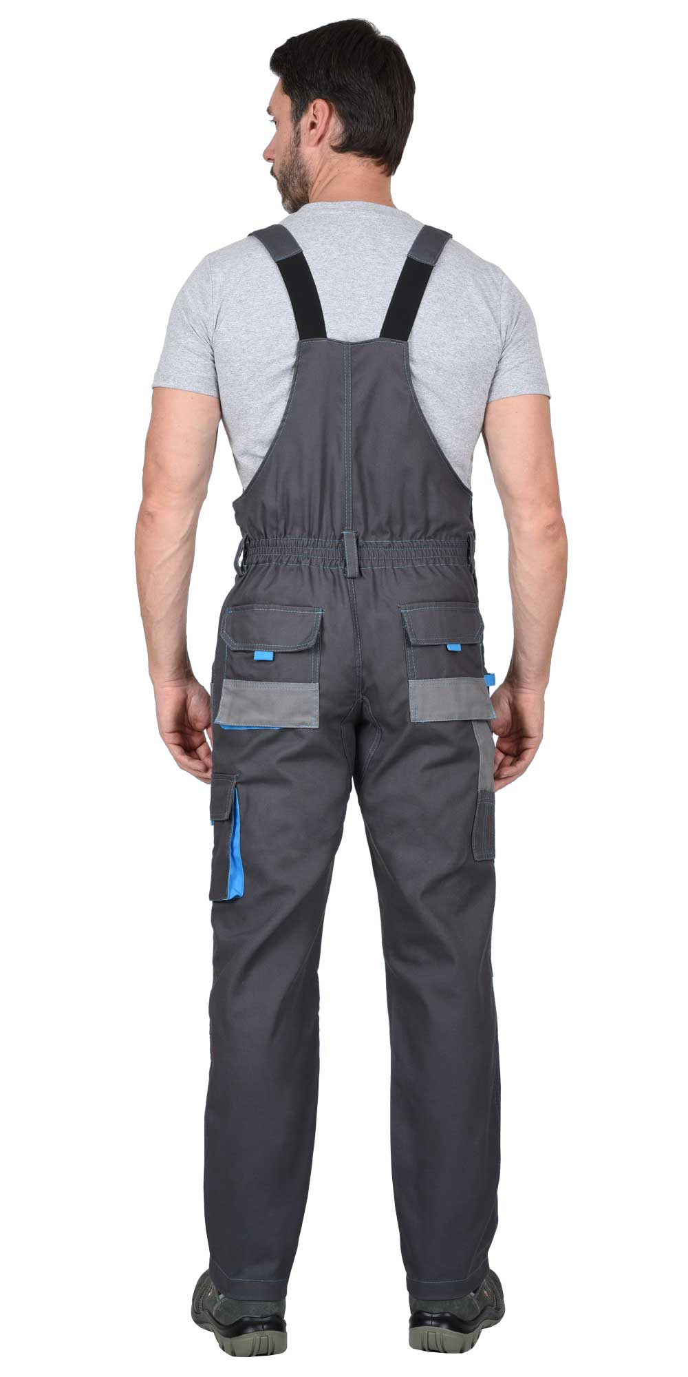 Полукомбинезон с застежкой гульфика на молнию; с застежкой в боковом шве на пуговицы; с накладным объемным комбинированным карманом на нагруднике с фигурным клапаном, застегивающимся на липучку; с нижними боковыми накладными комбинированными объемными карманами с наклонным входом; с накладным объемным карманом и фигурным клапаном на правом боковом шве, застегивающимся на липучку; с объемными наколенниками; с задними накладными объемными карманами; с комбинированным карманом для инструмента; в области талии по всей ширине с изнаночной стороны вставлена резинка для лучшего прилегания.