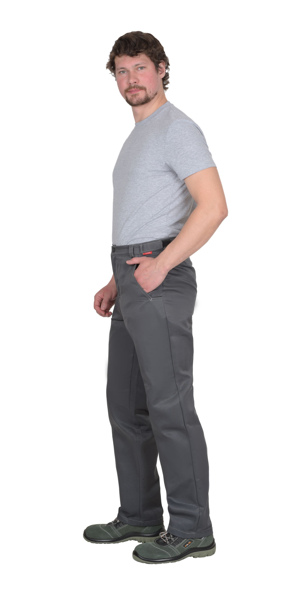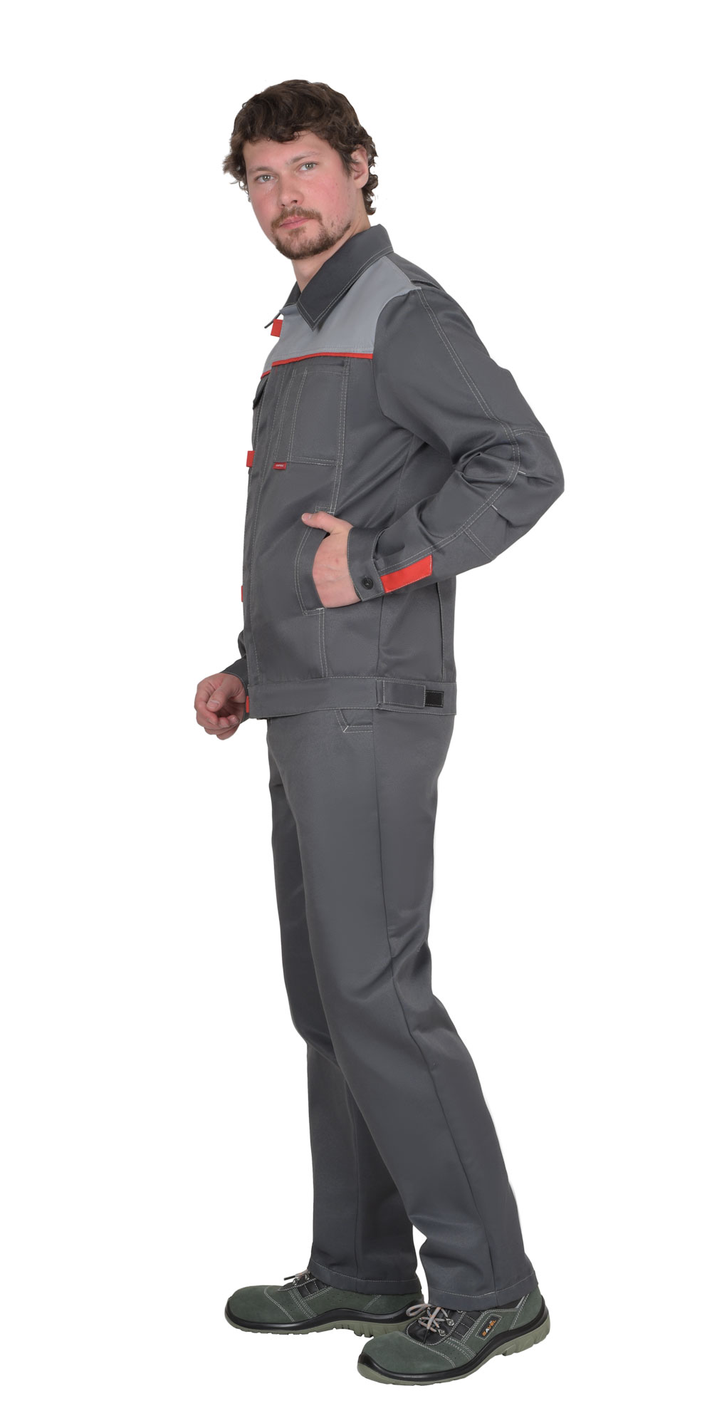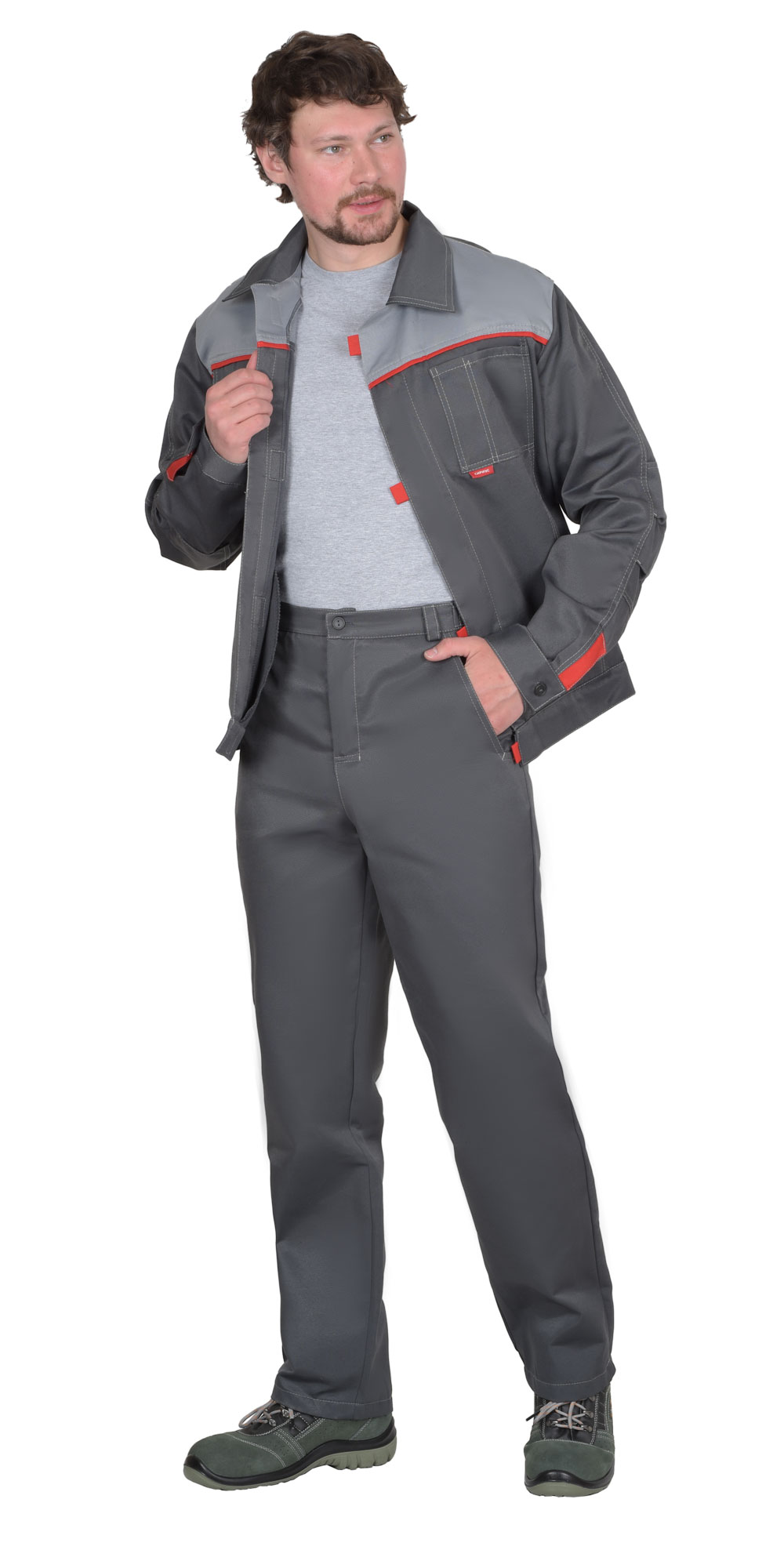 Костюм состоит из куртки и брюк. Куртка, укороченная с центральной потайной застежкой на молнию, застежкой борта и пояса на липучку. Верхние карманы с клапанами и хлястиком, застегивающимися на липучку. Боковые карманы в вертикальных швах. Пояс регулируется хлястиком на липучке. Воротник отложной. Вертикальные складки спинки увеличивают свободу движения. Контрастная отстрочка швов придает костюму оригинальность. Брюки с застежкой гульфика на молнию, боковыми внутренними карманами, с притачным поясом. Рекомендуется для рабочих специальностей. Современная практичная в эксплуатации и очень экономичная модель летней спецодежды. ГОСТ 12.4.280-2014