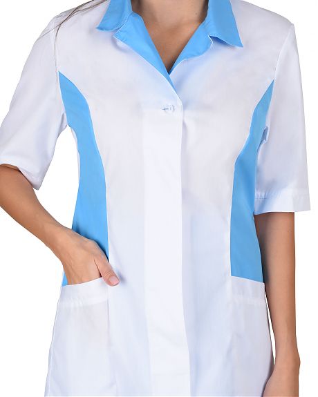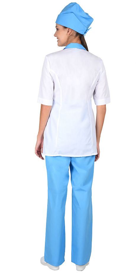 Костюм состоит из блузы, брюк и колпака. Блуза с центральной супатной застежкой на пуговицы. Боковые детали полочек, воротник и колпак из отделочной ткани. Рукава короткие. Брюки прямого покроя на резинке. Колпак с фигурной отделкой.