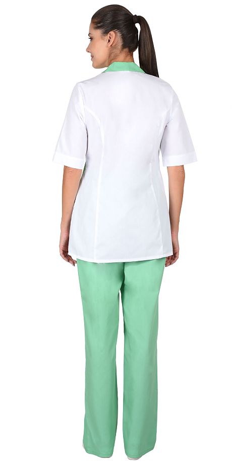 Костюм состоит из блузы, брюк и колпака. Блуза с центральной супатной застежкой на пуговицы. Боковые детали полочек, воротник и колпак из отделочной тканию Рукава короткие. Брюки прямого покроя на резинке. Колпак с фигурной отделкой.