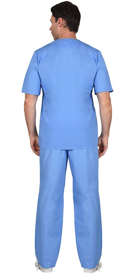 Костюм состоит из блузы и брюк. Блуза прямого покроя с V-образным вырезом горловины. На полочке один верхний и два нижних накладных кармана. Рукава короткие. Брюки прямого покроя на резинке.