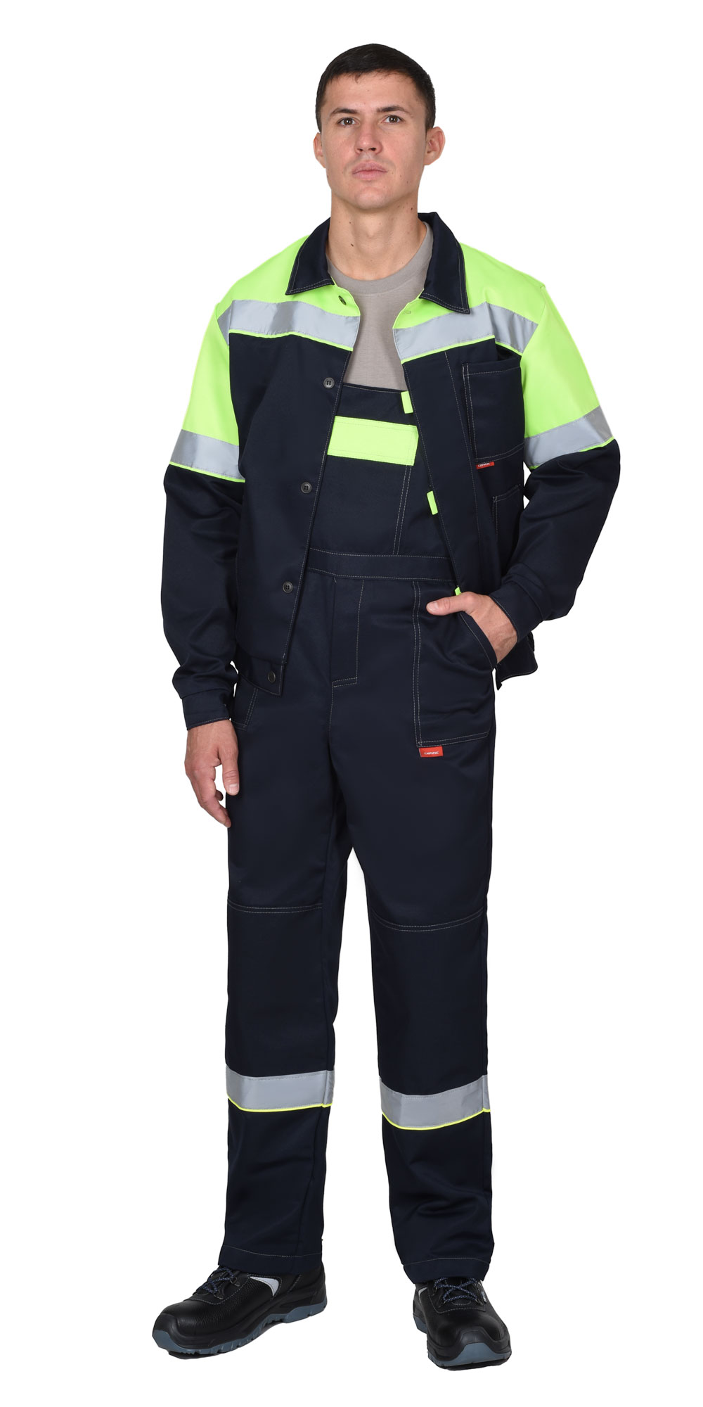 Полукомбинезон прямого кроя, с застежкой в правом боковом шве на пуговицы и спереди - гульфик с молнией. Полукомбинезон с нагрудным карманом с клапаном, боковыми карманами и с наколенниками. В полукомбинезоне предусмотрена лента светоотражающая ш.50 мм для сигнальной видимости.