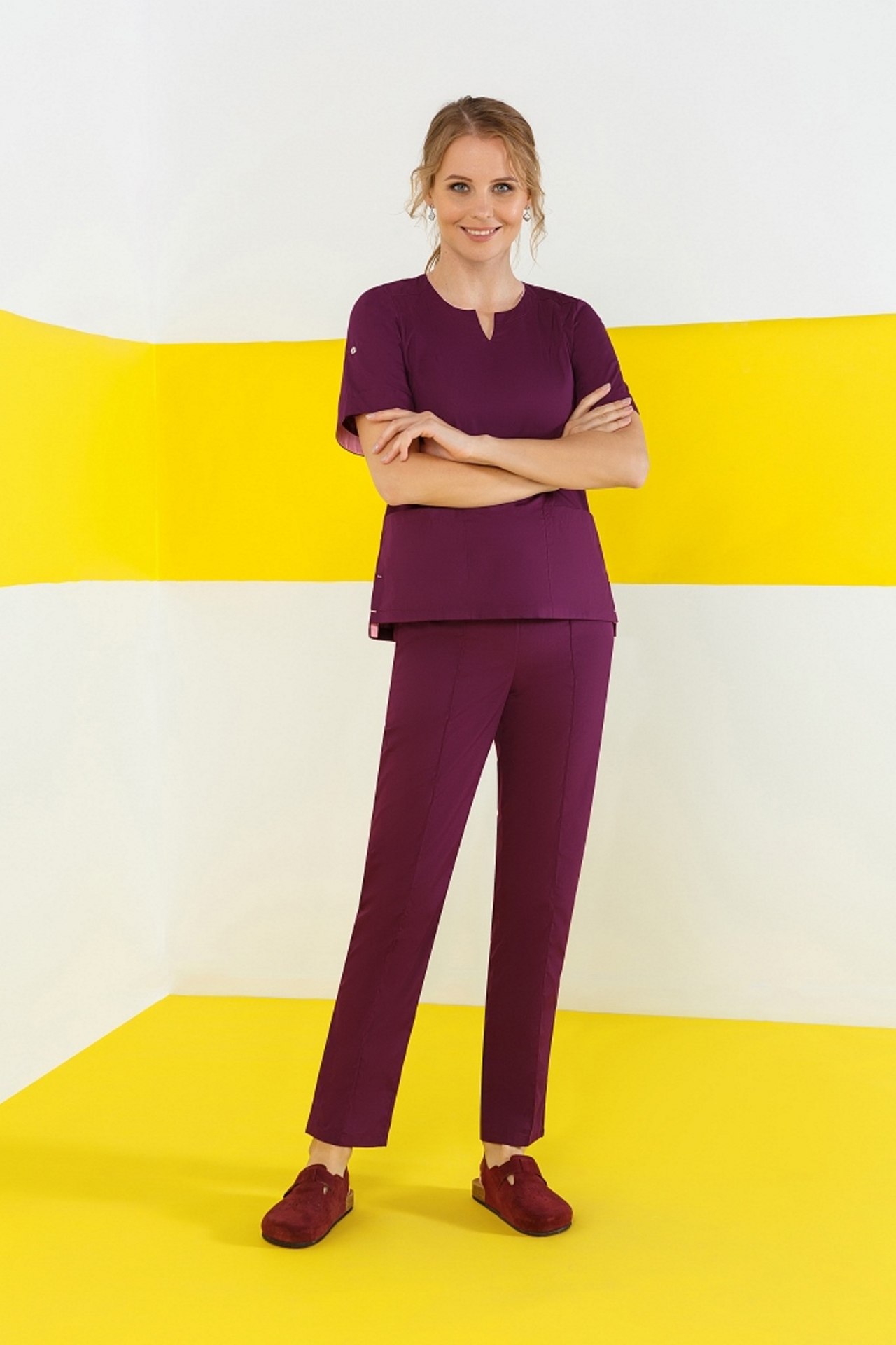 По передней части брюк затрочены стрелки, благодаря которым брюки сохраняют свою форму в течение всего рабочего дня.