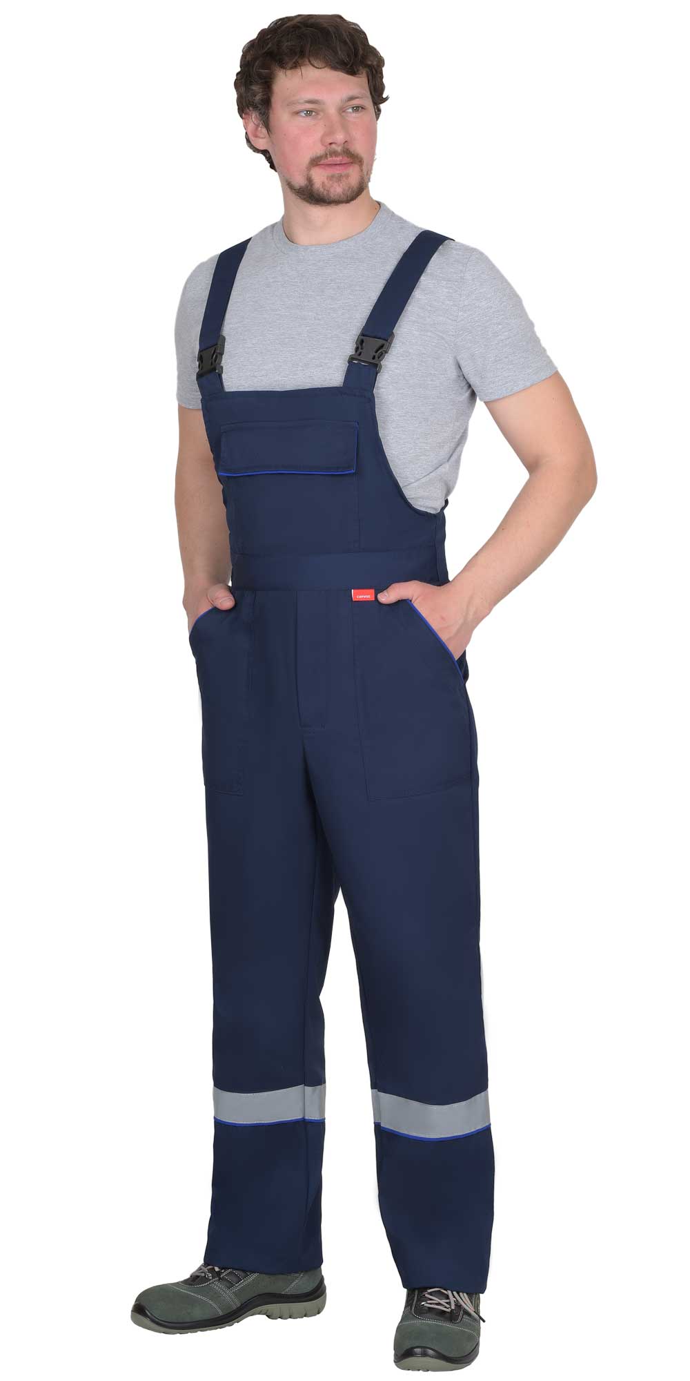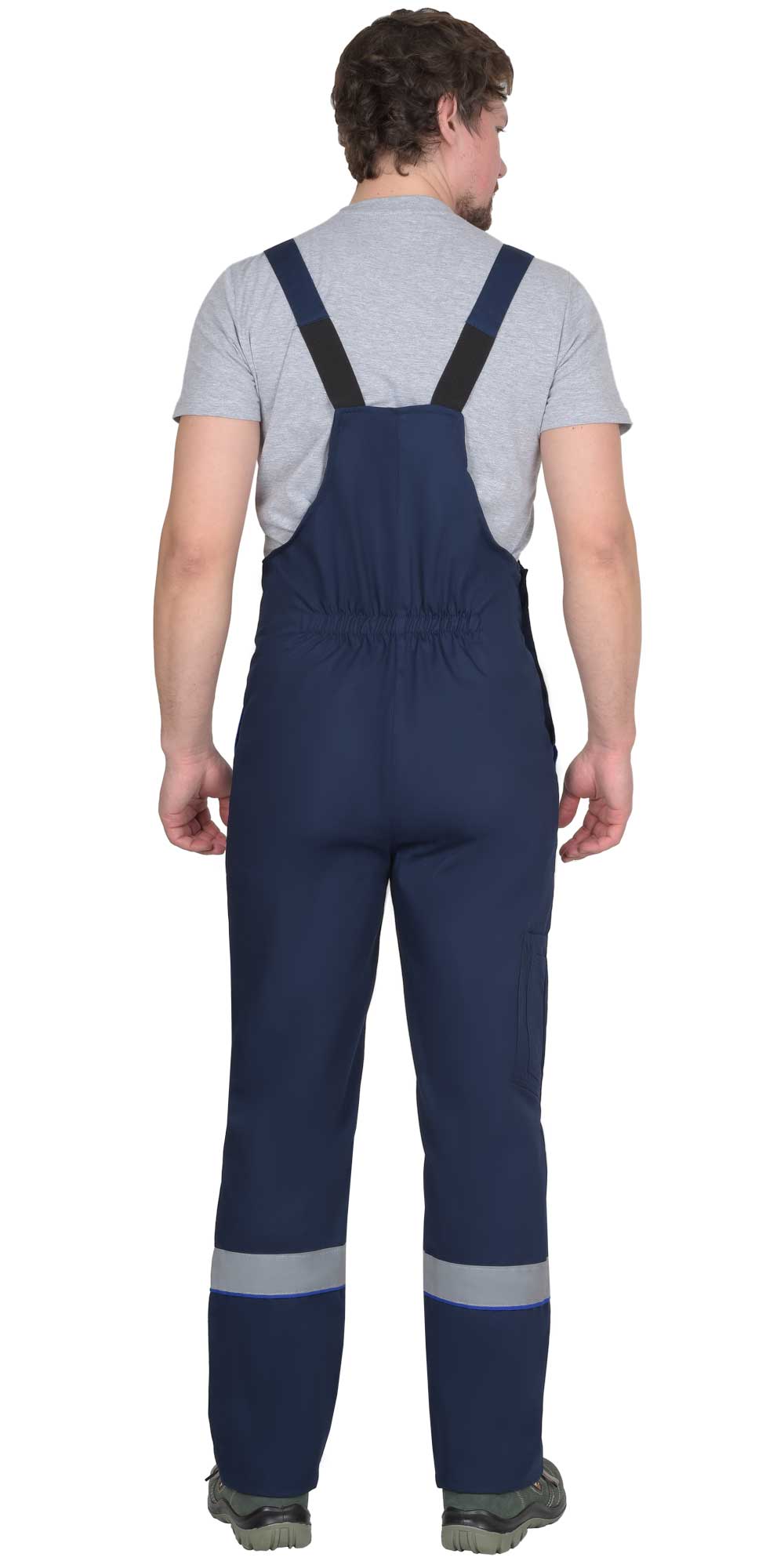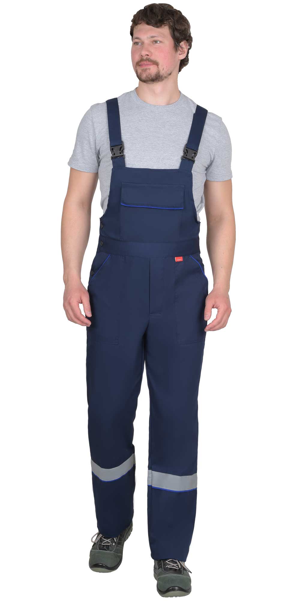 Полукомбинезон прямого силуэта, с застежкой спереди и с правого бока на пуговицы, с резинкой сзади для прилегания по фигуре, с накладными карманами спереди и карманами для инструмента сзади.
