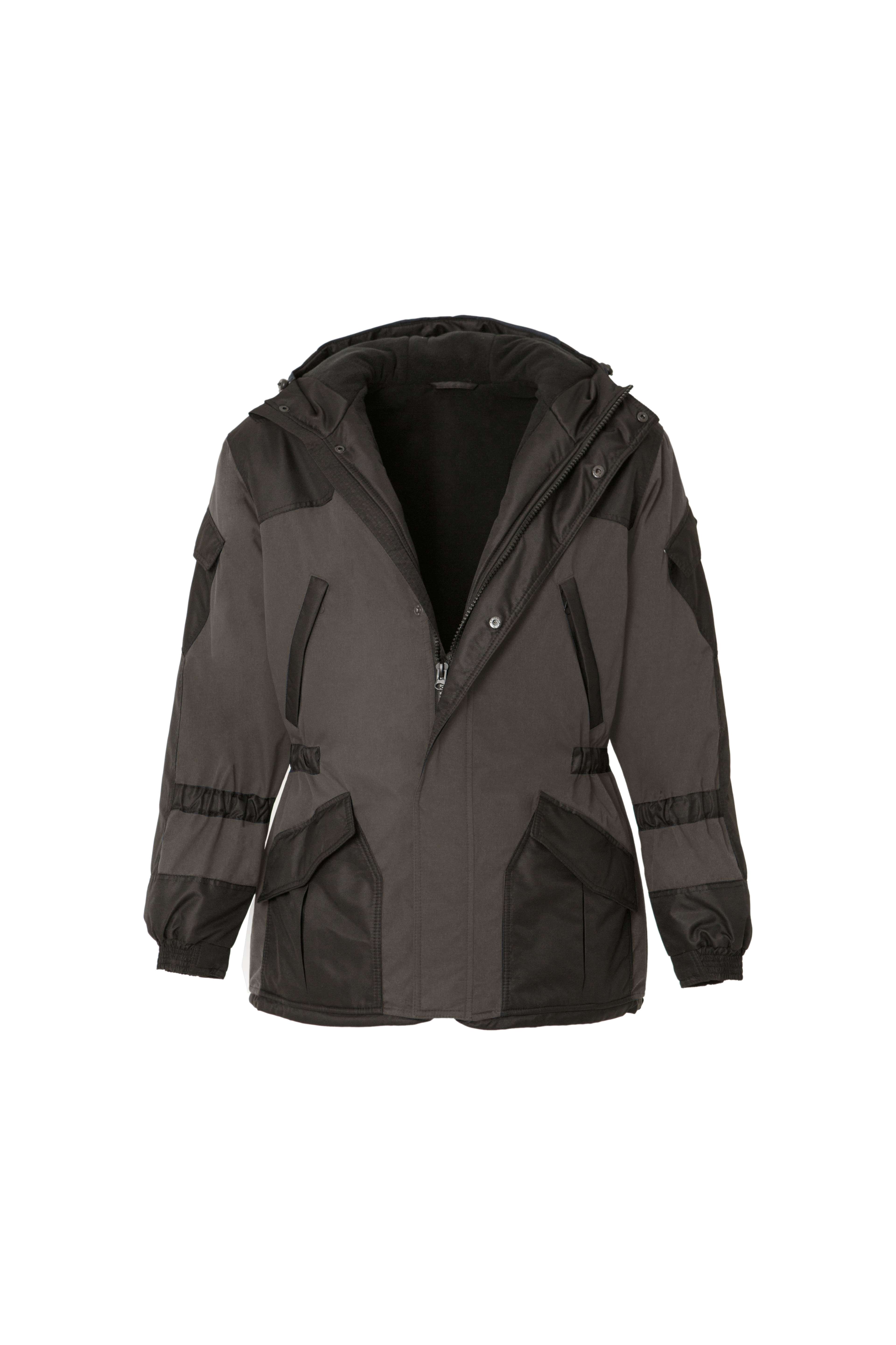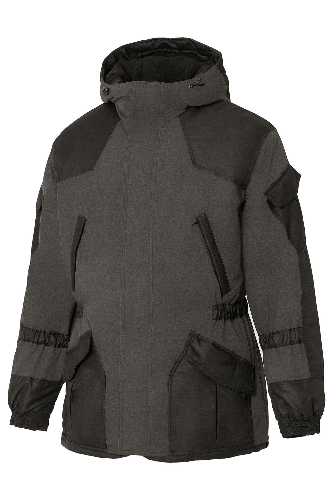 Втачной капюшон, утепленный флисом, длина лицевого выреза которого регулируется с помощью эластичного шнура и фиксаторов.
