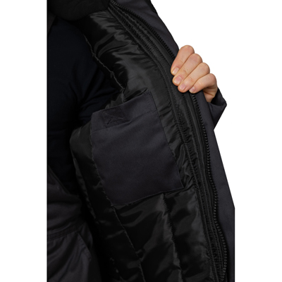 Капюшон: съёмный, с притачной утеплённой подкладкой, застёгивается на контактную ленту. На центральной части настрочена СОП шириной 50 мм, а также расположен хлястик с креплением на ленту контактную для возможности регулировки глубины капюшона. Регулировка объёма капюшона возможна с помощью эластичного шнура с фиксаторами и наконечниками. Капюшон пристёгивается к верхнему воротнику на молнию, закрытую планкой.