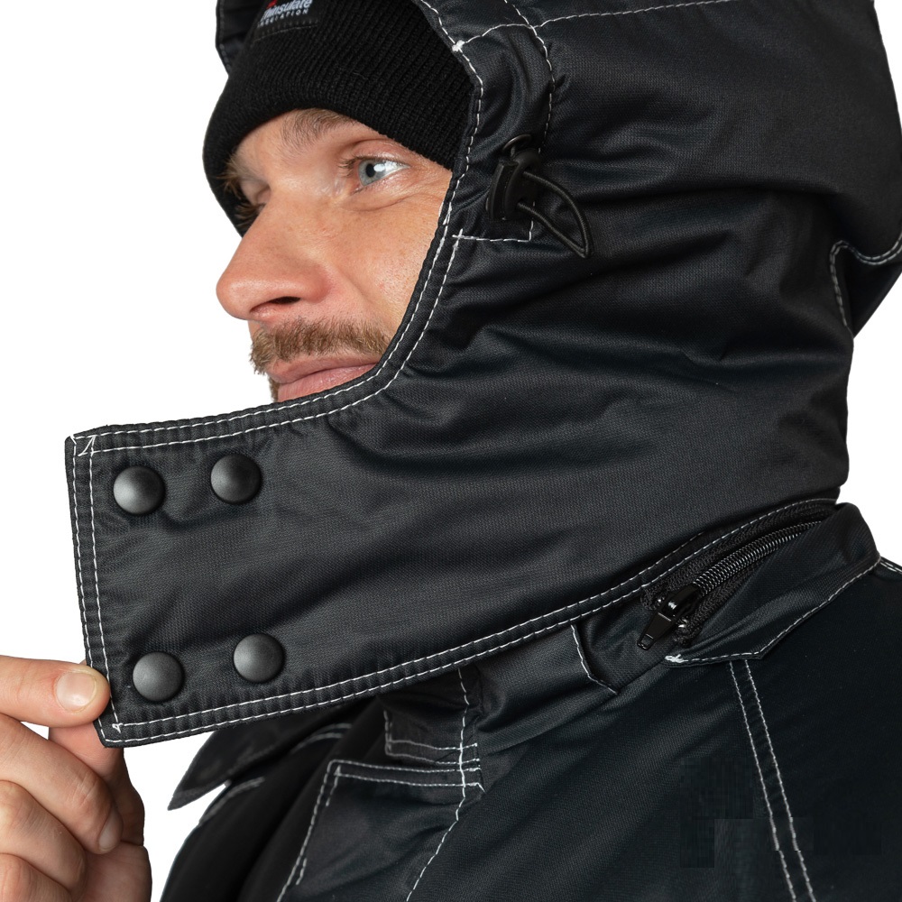 • куртка с дополнительной к внешней внутренней утеплённой ветрозащитной планкой и термостежкой на утепленной подкладке, капюшоном с регулировкой, дополненным флисом;