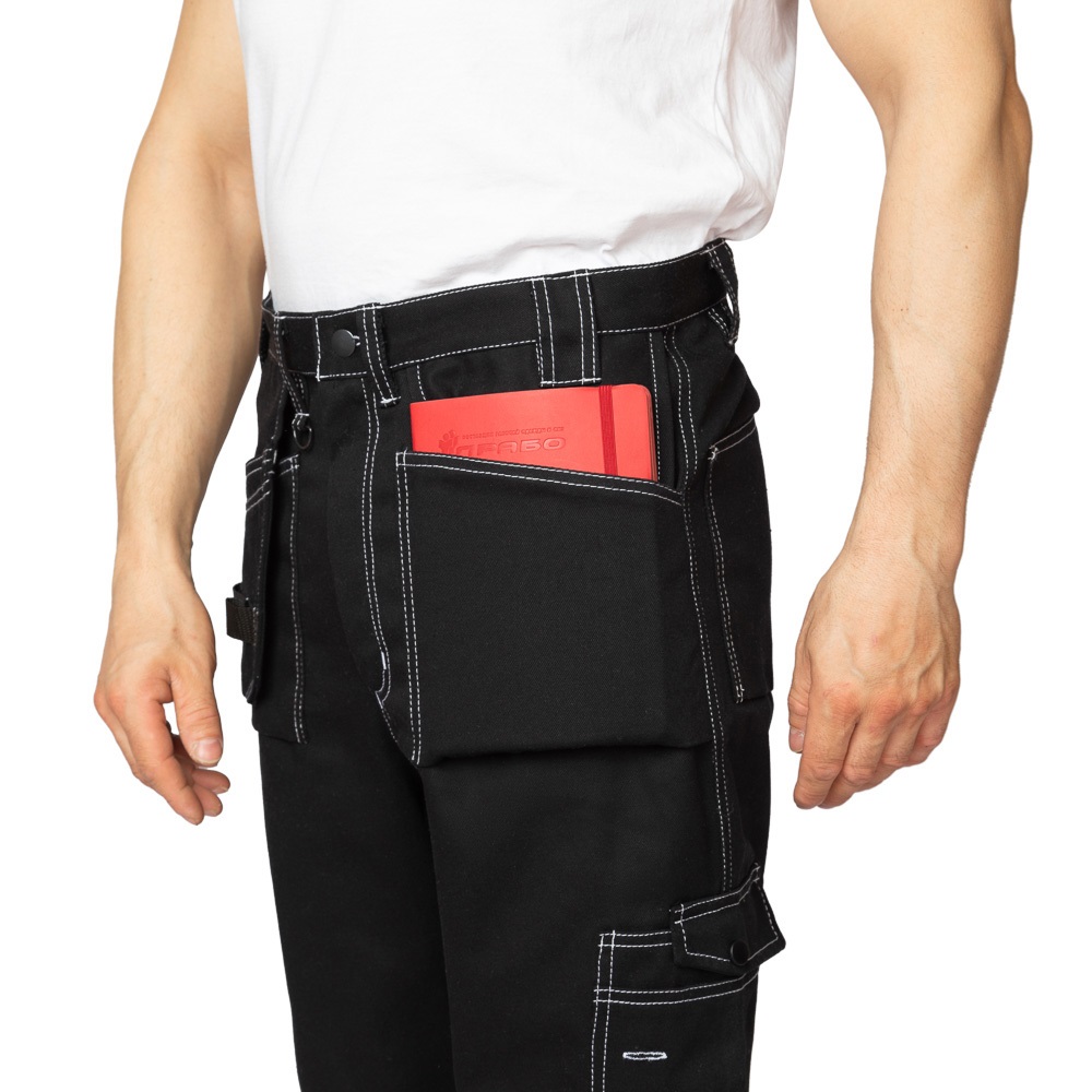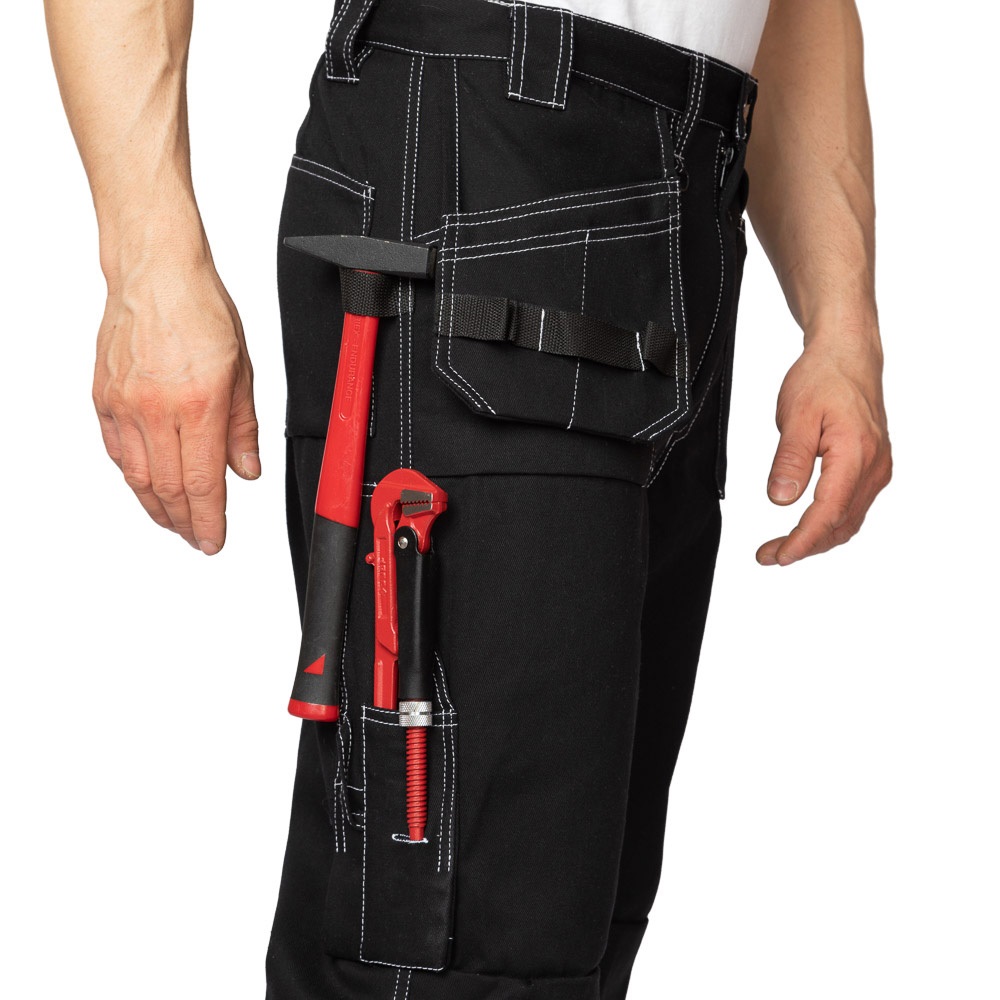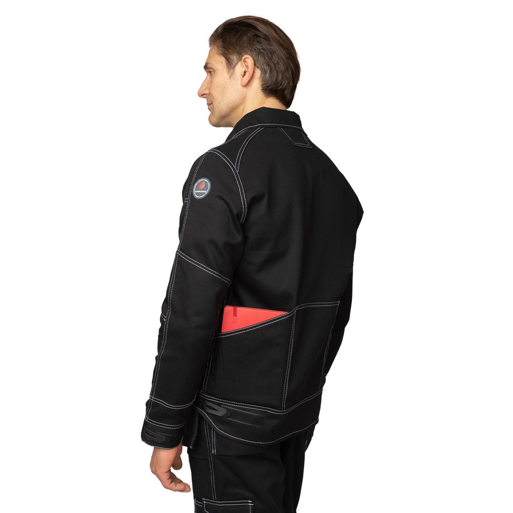 Карманы: куртка: внешние передние карманы на молнии: 2 сверху, 2 снизу, 1 карман на левом плече, размер которого позволяет разместить телефон или пропуск; на спинке куртки 2 кармана увеличенного размера – в них можно разместить документы или блокнот; 1 внутренний карман с застежкой на контакт-ленту. Брюки: передние двойные карманы предусмотрены для размещения в них инструментов – они легко достаются из внутреннего кармана, если необходимости в карманах нет – они также легко убираются; правый набедренный карман с боковыми петлями удобен для ношения столярно-слесарного инструмента, прорези обеспечивают дополнительную фиксацию негабаритных предметов; левый набедренный карман закрывается клапаном на кнопке, его можно использовать для размещения расходных материалов.