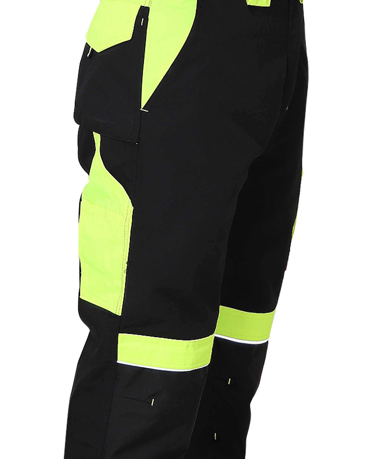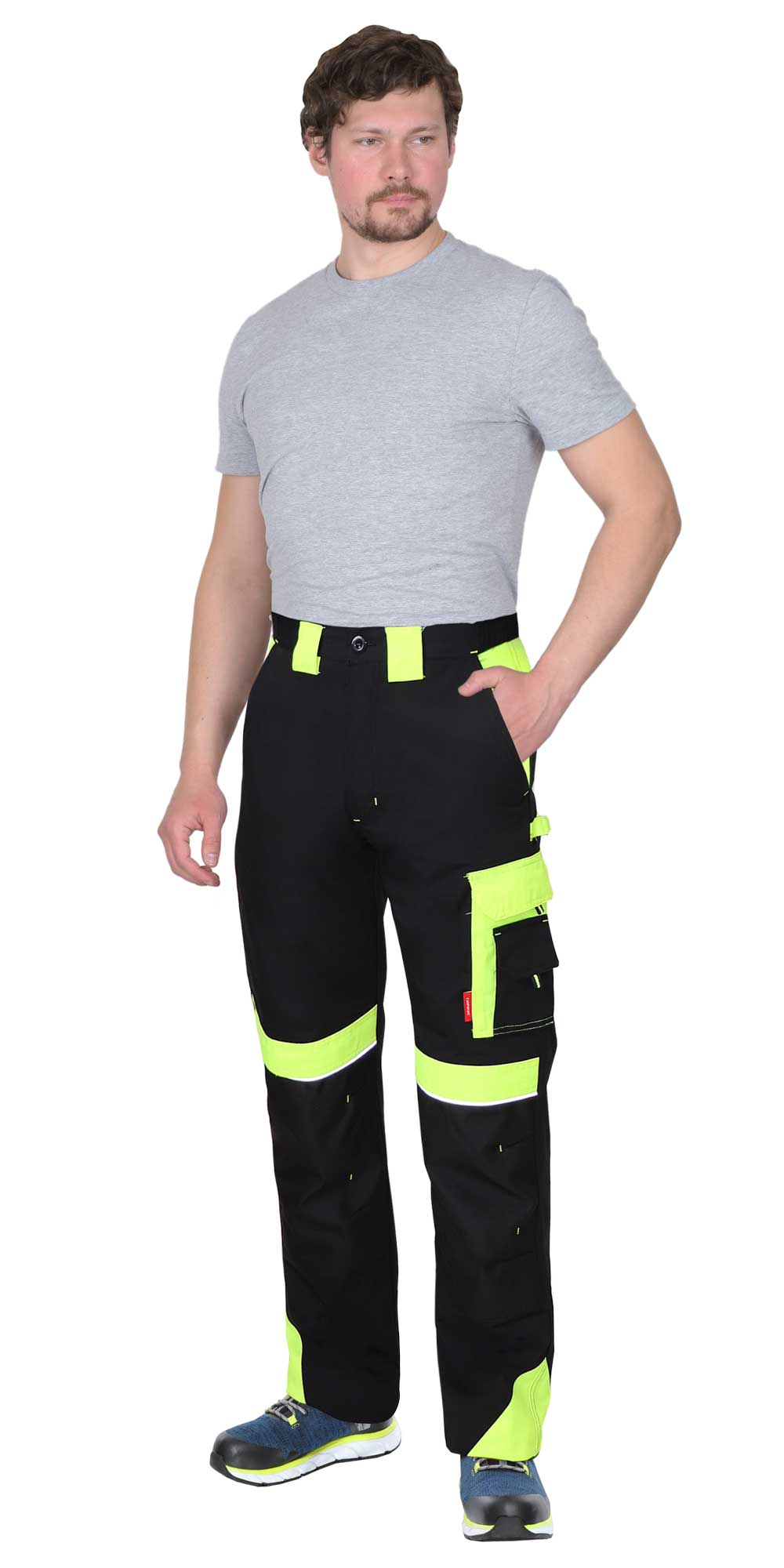 Брюки прямые с застёжкой спереди на гульфик с молнией, с отрезным поясом, с накладными карманами сзади и на левом боковом шве, с объёмными наколенниками из плотной, непромокаемой ткани с верхним входом для амортизационного вкладыша. В брюках предусмотрен светоотражающий кант.