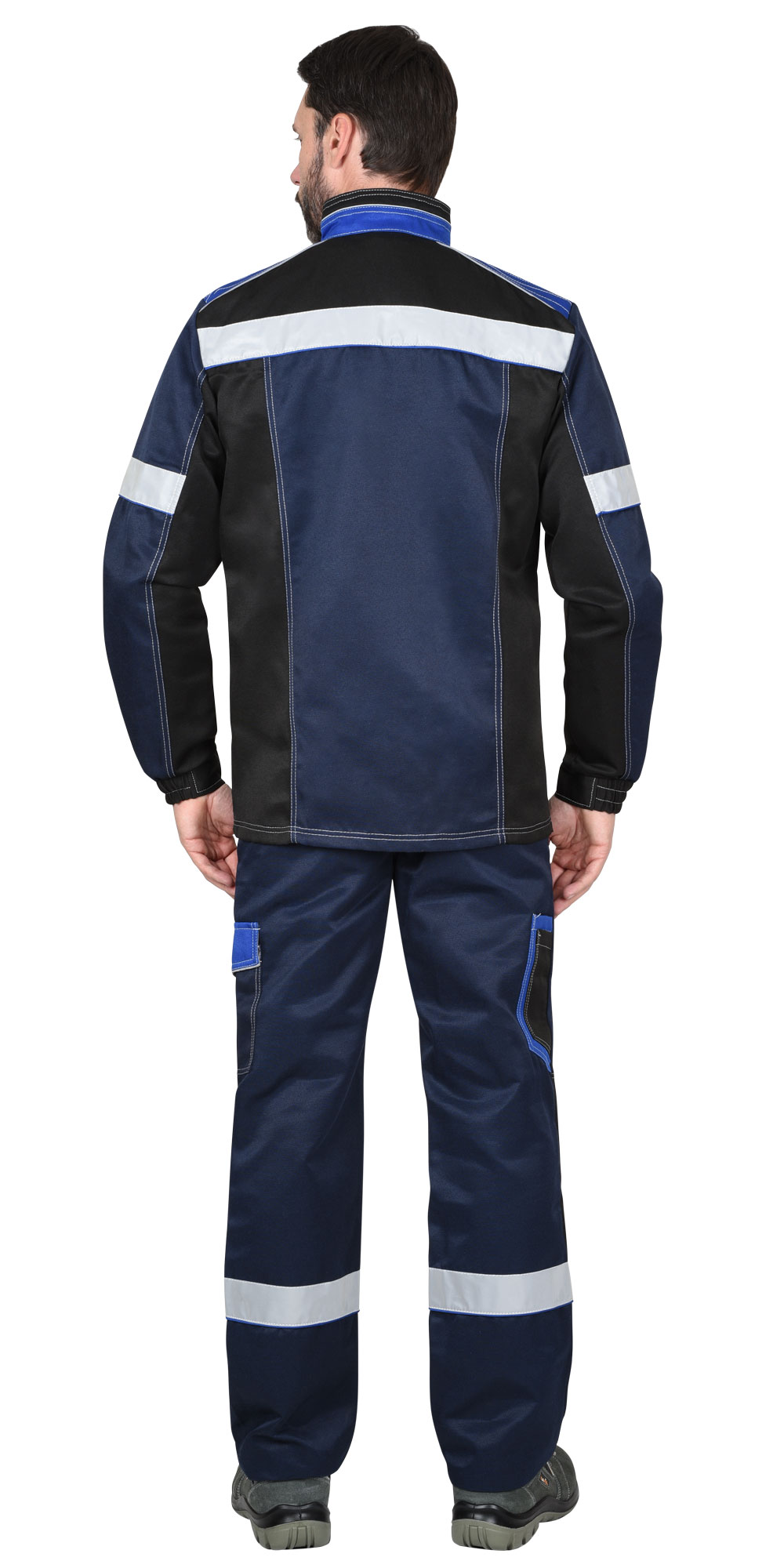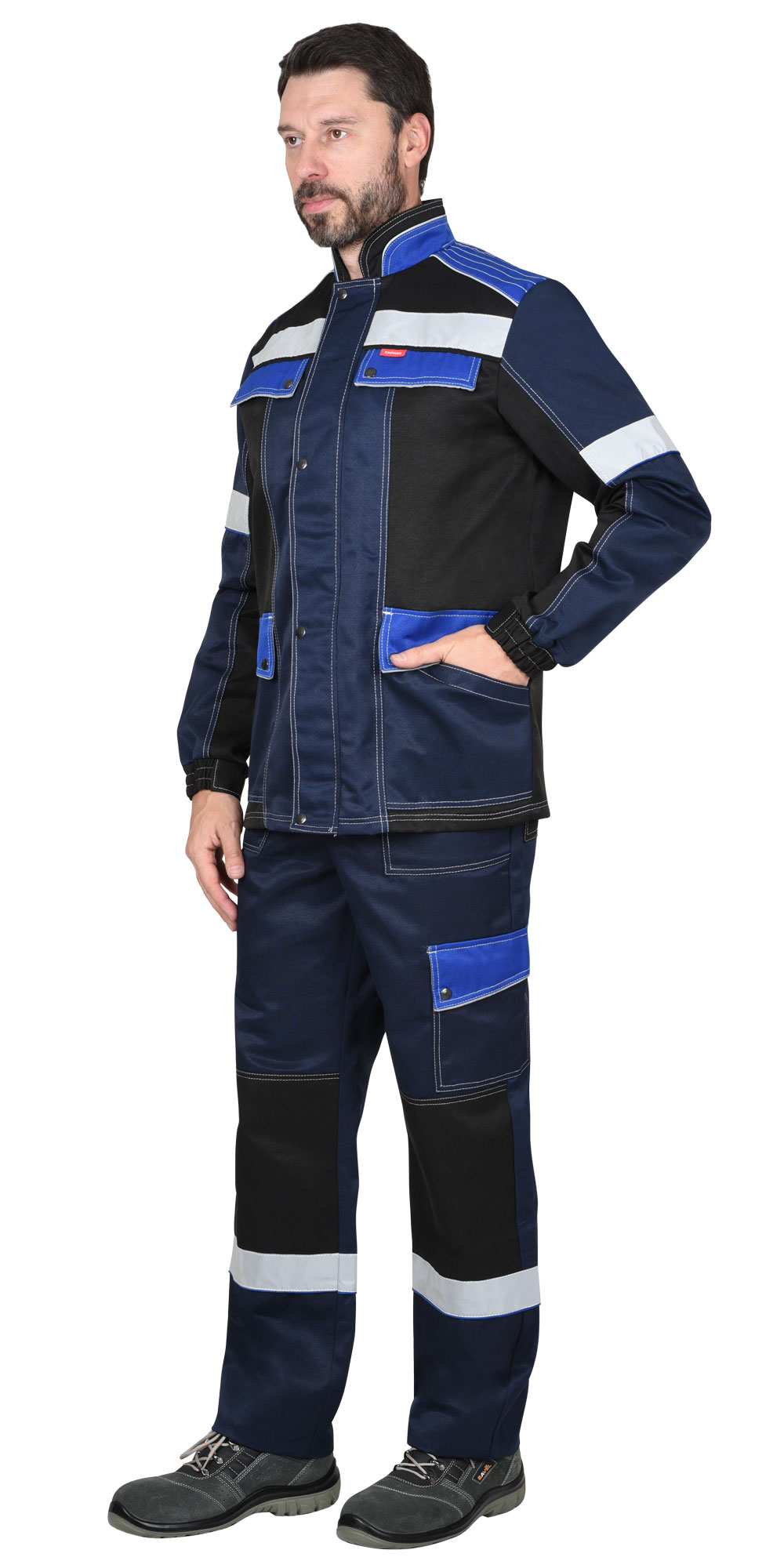 Куртка длинная, с центральной застёжкой на тесьму - «молния», с ветрозащитной планкой на 4 кнопки, воротник – стойка, с верхними прорезными карманами и фигурными клапанами на кнопку и липучку, с нижними накладными карманами и фигурными клапанами и кнопкой. Рукава втачные, разрезные с притачными манжетами, манжеты частично стянуты на резинку ткацкую. В куртке вшивается Кант СВМ 3мм светоотражающий и Лента светоотражающая (мелкодисперсная белая) 50 мм. для обозначения сигнальной видимости. Брюки прямого силуэта, с застёжкой гульфика на пуговицы, с притачным поясом с частичной стяжкой по бокам, с боковыми накладными карманами на передних половинках, с карманом на боковом шве и фигурным клапаном на кнопку и липучку, с наколенниками, с карманами на задних половинках, с карманами для инструментов. В брюках вшивается Лента светоотражающая 50 мм. для обозначения сигнальной видимости.