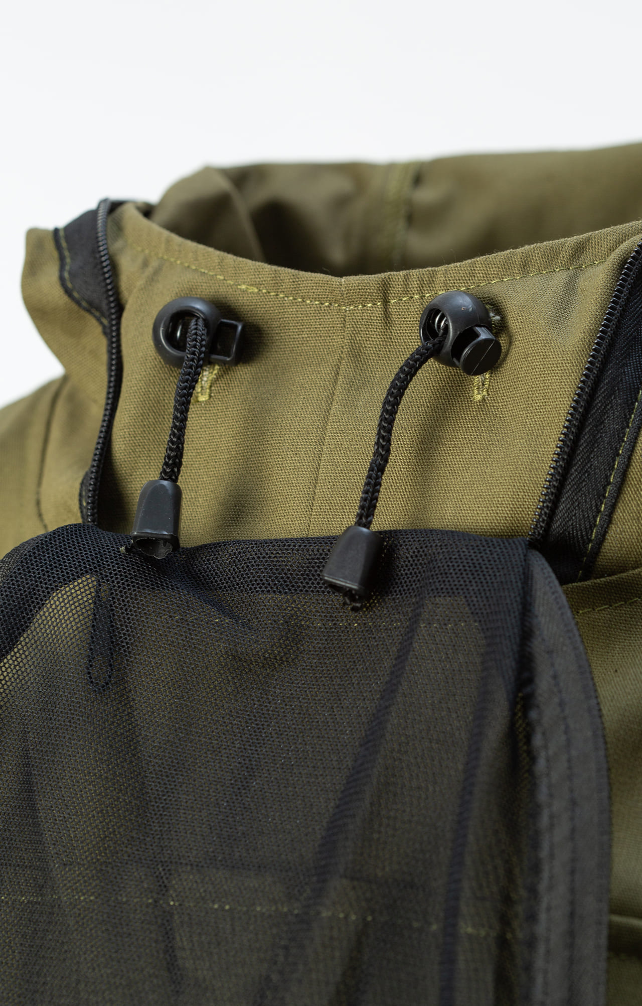 - На капюшоне куртки москитная сетка, пристегивающаяся на молнию.