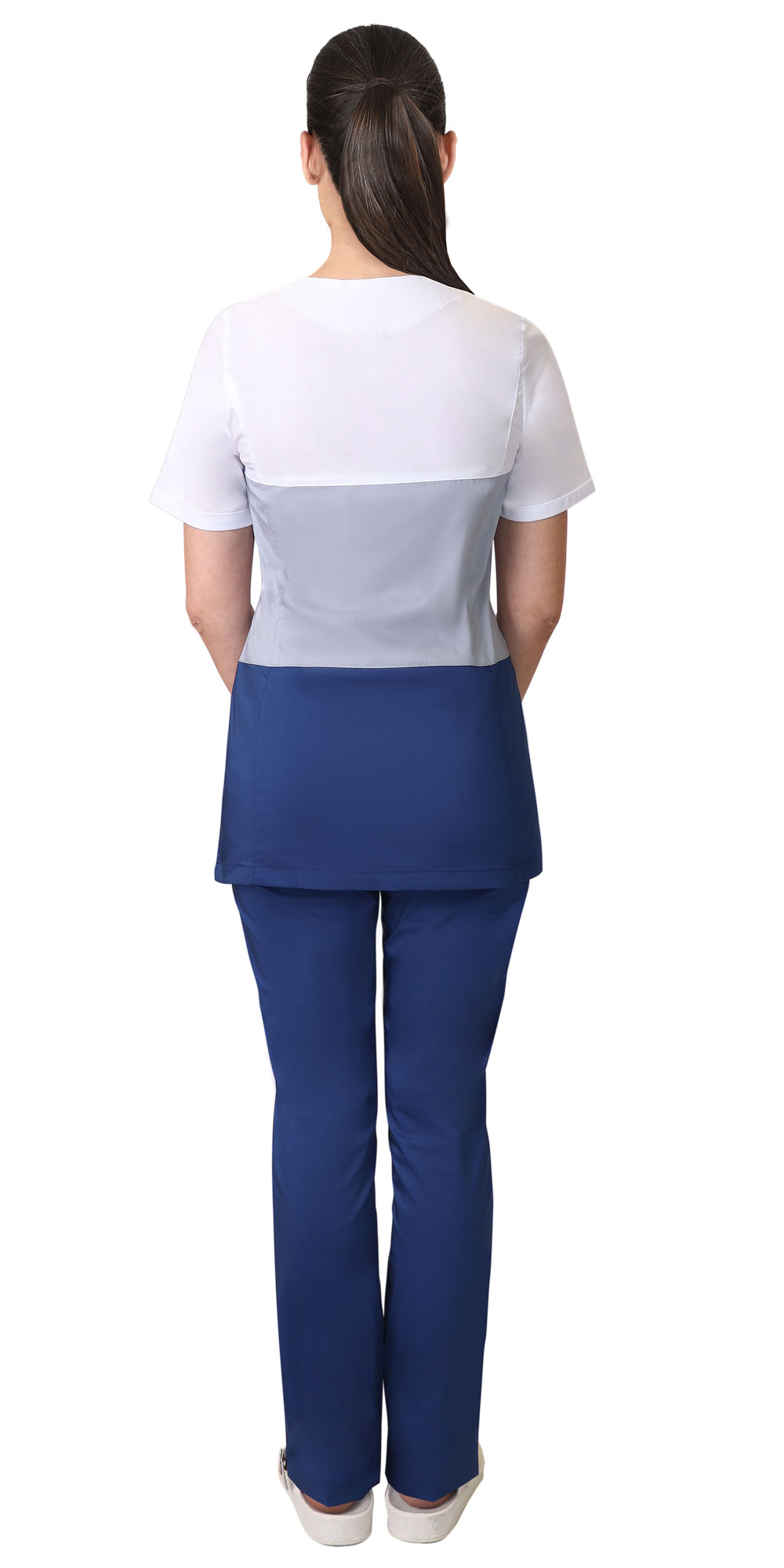 Блуза полуприлегающего силуэта, без застёжки, с овальным вырезом. Нижние горизонтальные карманы в швах с листочкой. Рукава втачные, короткие. По боковым швам разрезы. Брюки прямого силуэта, с застежкой гульфика на тесьму "молния", притачным поясом, застегивающимся на пуговицу, частично стянутым резинкой по боковым сторонам. Два боковых и два накладных задних кармана.