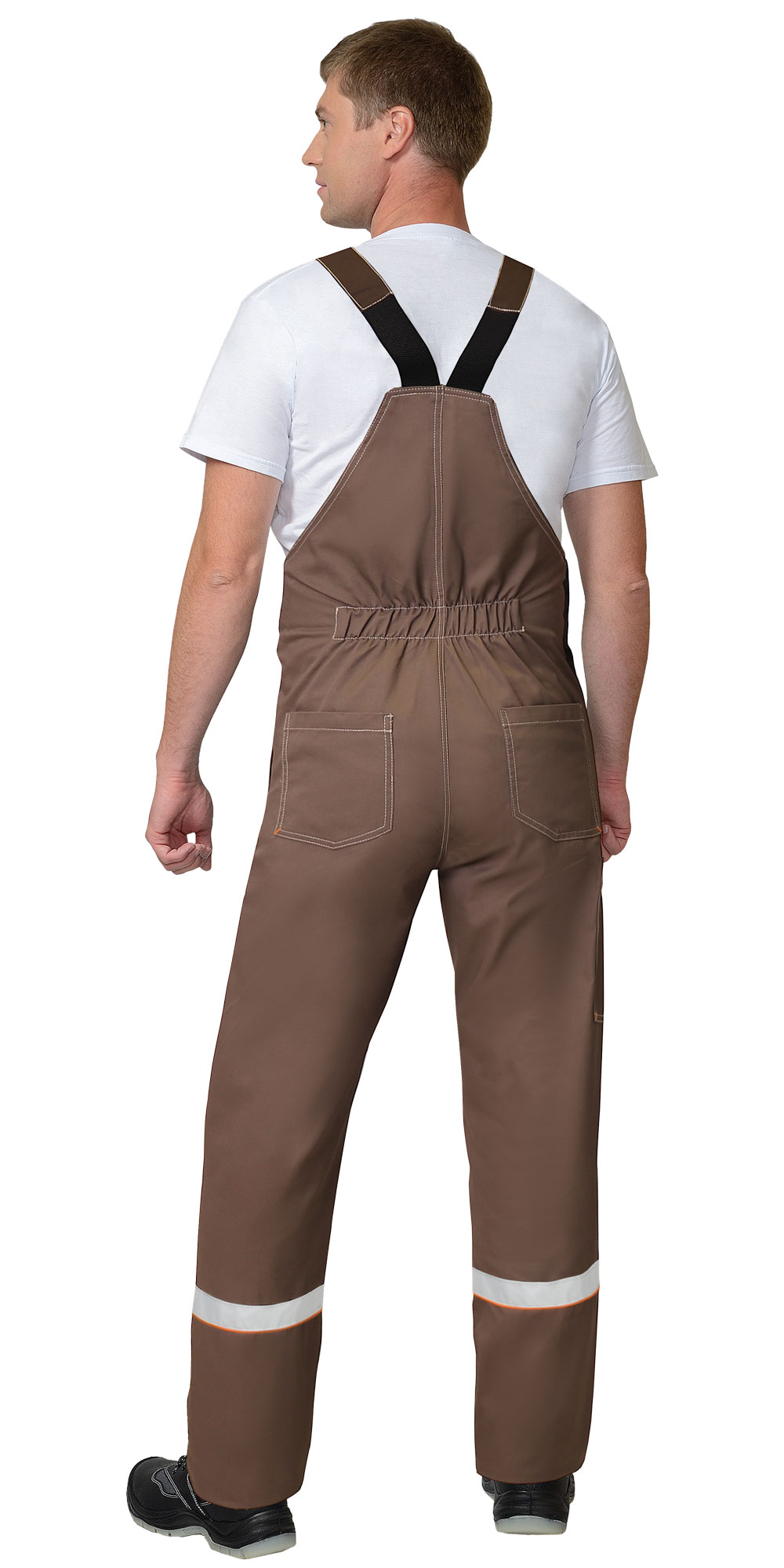 Полукомбинезон прямой, с застежкой в правом боковом шве на пуговицы, гульфик с молнией. С различными карманами и усиленными наколенниками. Спинка с частичной стяжкой по талии, бретели регулируются при помощи застежек-фастексов и резинки.