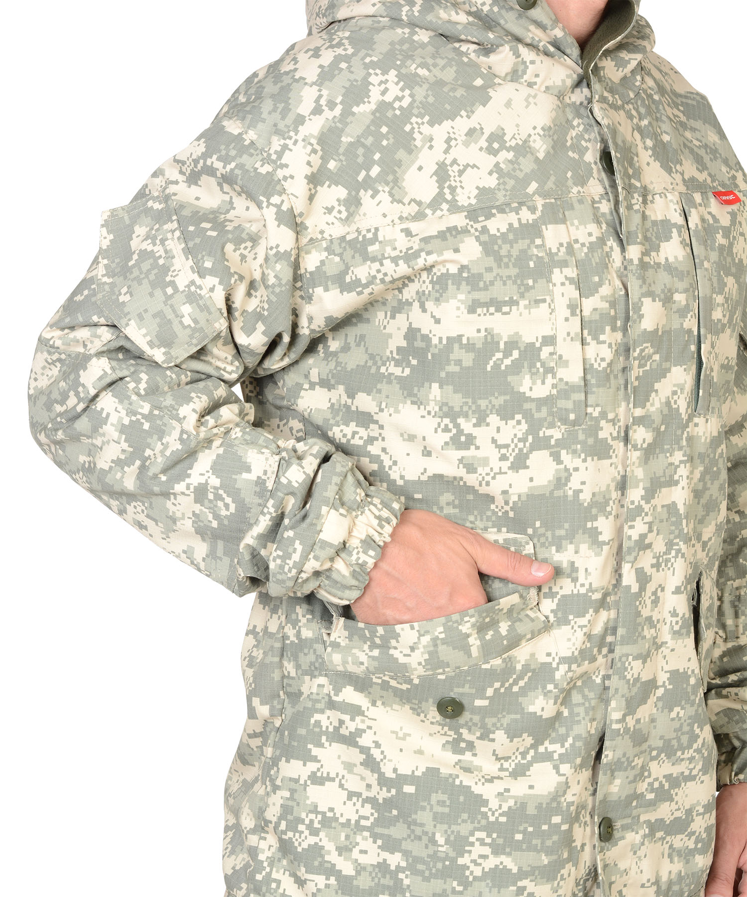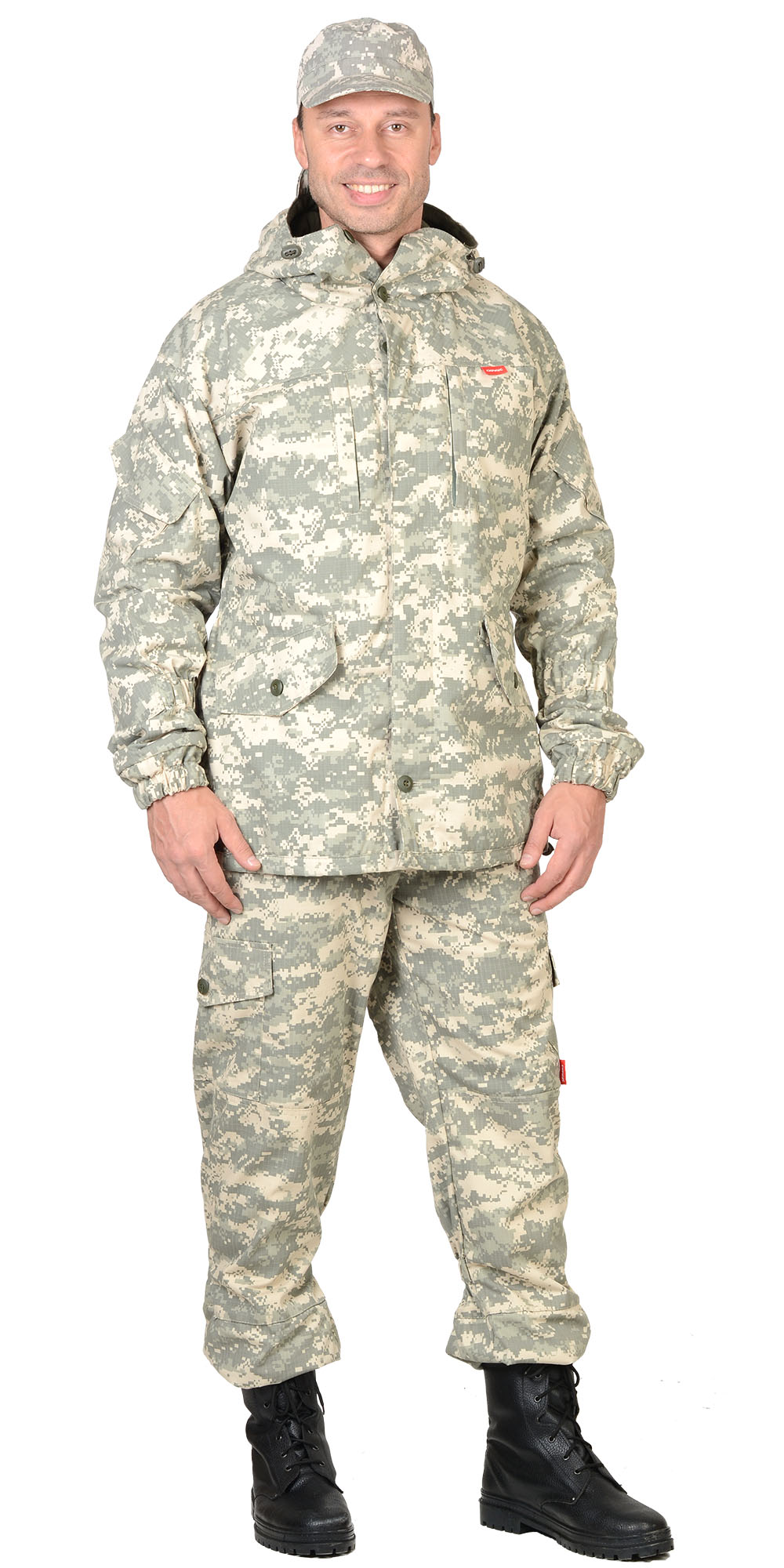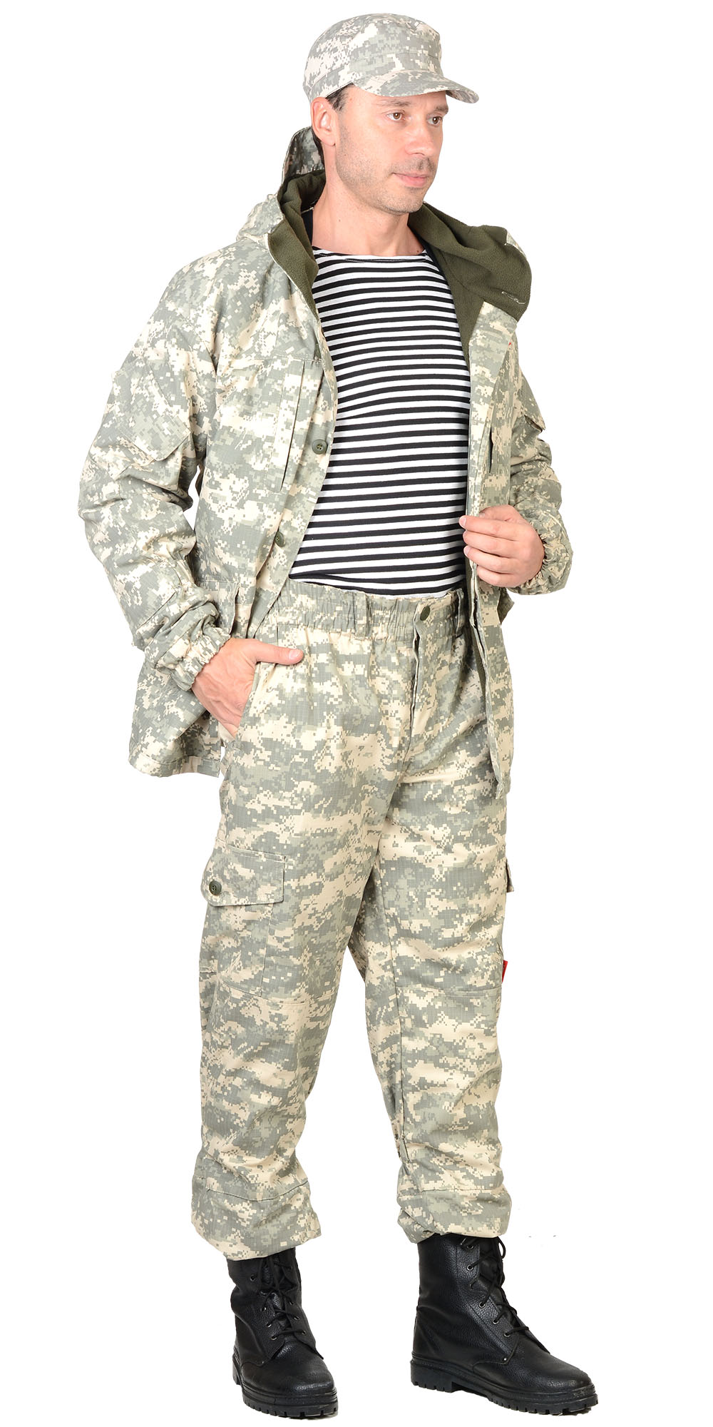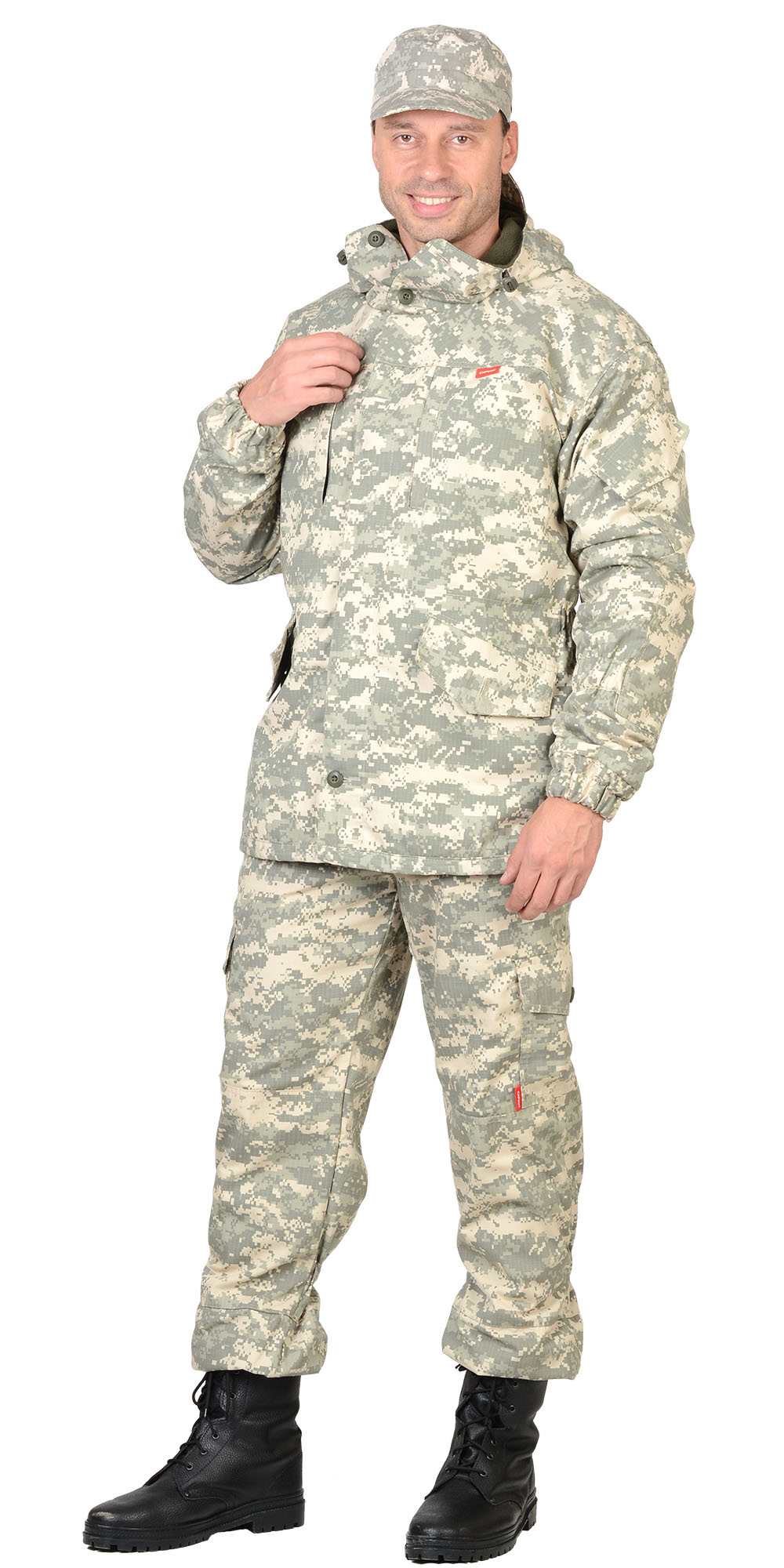 Куртка прямого силуэта, с центральной супатной застежкой на пуговицы, нижняя петля сквозная, с верхними карманами листочка на «молнию», с нижними карманами «листочка» с настрочными концами и фигурным клапанами на пуговицу, с внутренним карманом на «молнию». Рукава с полу объемными накладными карманами и фигурными клапанами на «липучку», с притачной нижней деталью на резинке, с налокотниками. Капюшон с козырьком, кулисами для регулировки, застежкой на пуговицы. По талии и низу куртки регулирует шляпной резинкой и фиксатором.Брюки с застежкой гульфика на пуговицы, пояс цельнокроеный на пуговицу, со шлевками, с резинкой по всей ширине цельнокроеного пояса, со съ.мными бретелями, с карманами в боковых швах, с задними накладными карманами застегивающиеся на пуговицу, с накладными карманами с объ.мом на боковых швах с фигурными клапанами на пуговицу, с наколенниками. Понизу брюк пуфта с завязками.ГОСТ 2595-2003Ткань смесовая «Рип-Стоп» 65% п/э, 35% х/б. Утеплитель:: «Флис» 100% п/э.