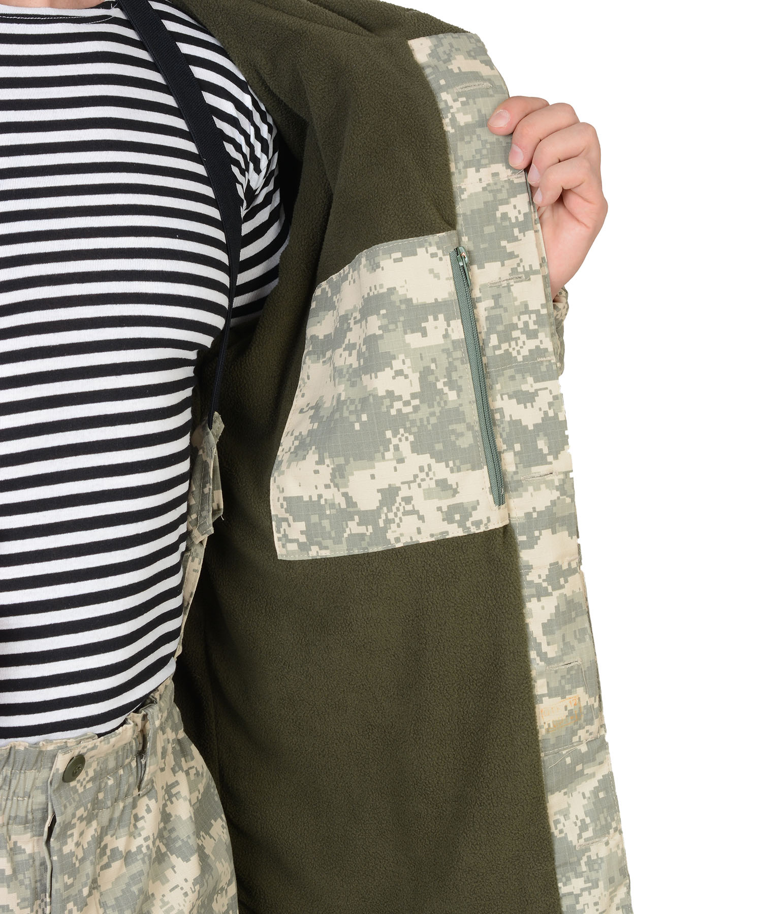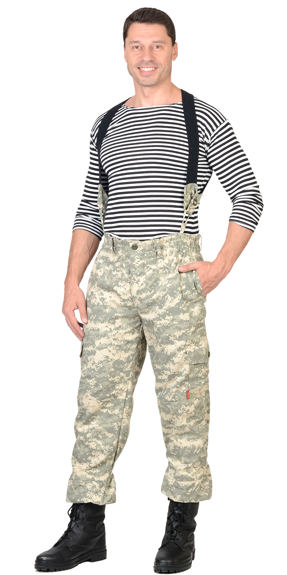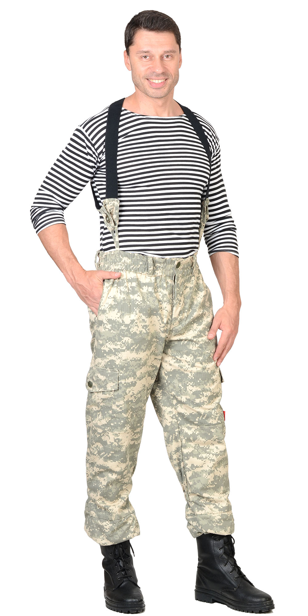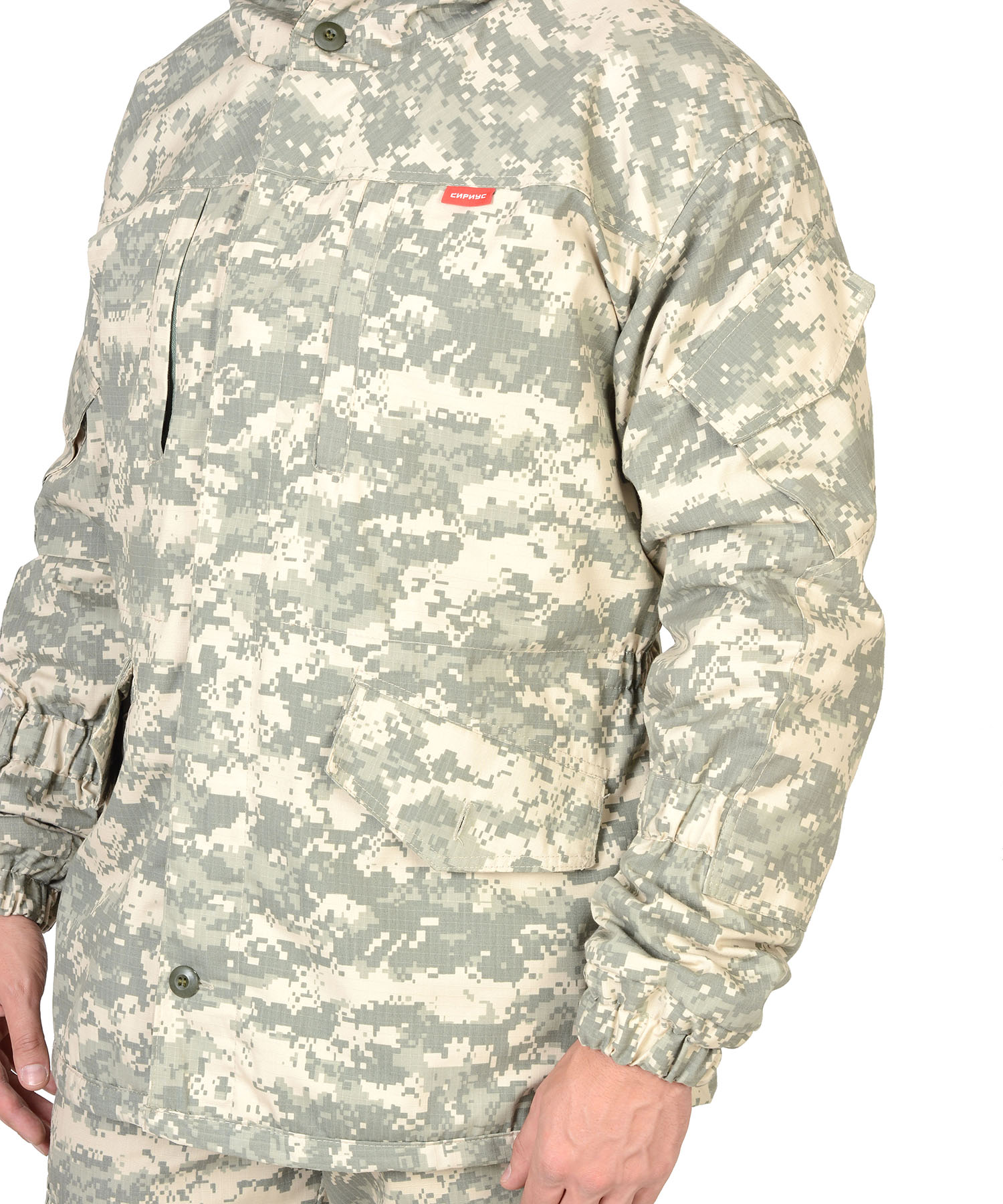 Куртка прямого силуэта, с центральной супатной застежкой на пуговицы, нижняя петля сквозная, с верхними карманами листочка на «молнию», с нижними карманами «листочка» с настрочными концами и фигурным клапанами на пуговицу, с внутренним карманом на «молнию». Рукава с полу объемными накладными карманами и фигурными клапанами на «липучку», с притачной нижней деталью на резинке, с налокотниками. Капюшон с козырьком, кулисами для регулировки, застежкой на пуговицы. По талии и низу куртки регулирует шляпной резинкой и фиксатором.Брюки с застежкой гульфика на пуговицы, пояс цельнокроеный на пуговицу, со шлевками, с резинкой по всей ширине цельнокроеного пояса, со съ.мными бретелями, с карманами в боковых швах, с задними накладными карманами застегивающиеся на пуговицу, с накладными карманами с объ.мом на боковых швах с фигурными клапанами на пуговицу, с наколенниками. Понизу брюк пуфта с завязками.ГОСТ 2595-2003Ткань смесовая «Рип-Стоп» 65% п/э, 35% х/б. Утеплитель:: «Флис» 100% п/э.