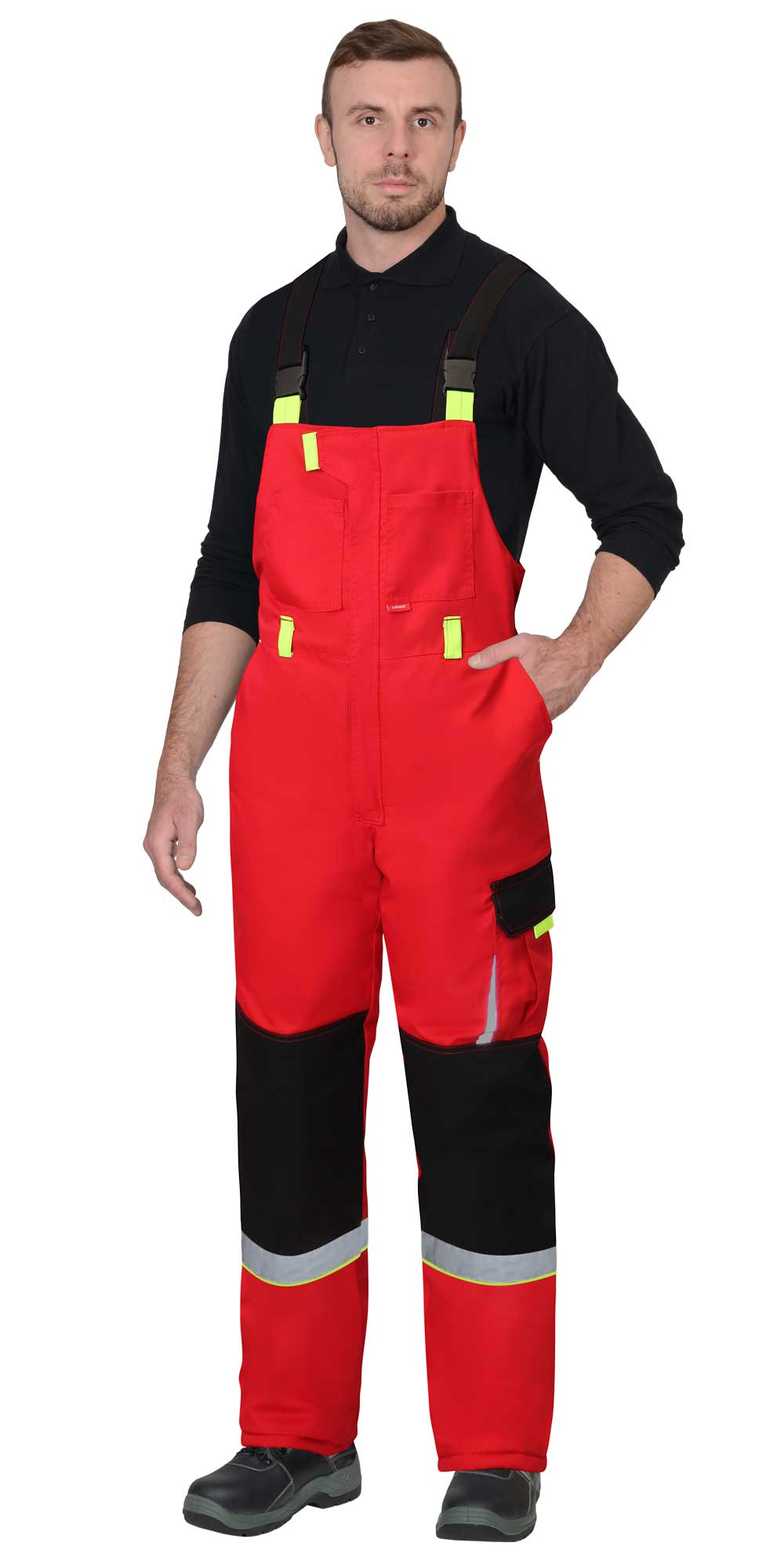 Полукомбинезон на утеплённой подкладке, с бретелями, с центральной застёжкой на молнию, которая закрыта ветрозащитной планкой, с наколенниками, спереди полукомбинезон с нагрудными и боковыми карманами, сзади с верхними карманами и карманами для инструментов, с резинкой в области талии. Бретели с помочной резинкой, регулируются пряжками - фастексами. Для обозначения сигнальной видимости в полукомбинезоне предусмотрена светоотражающая лента.