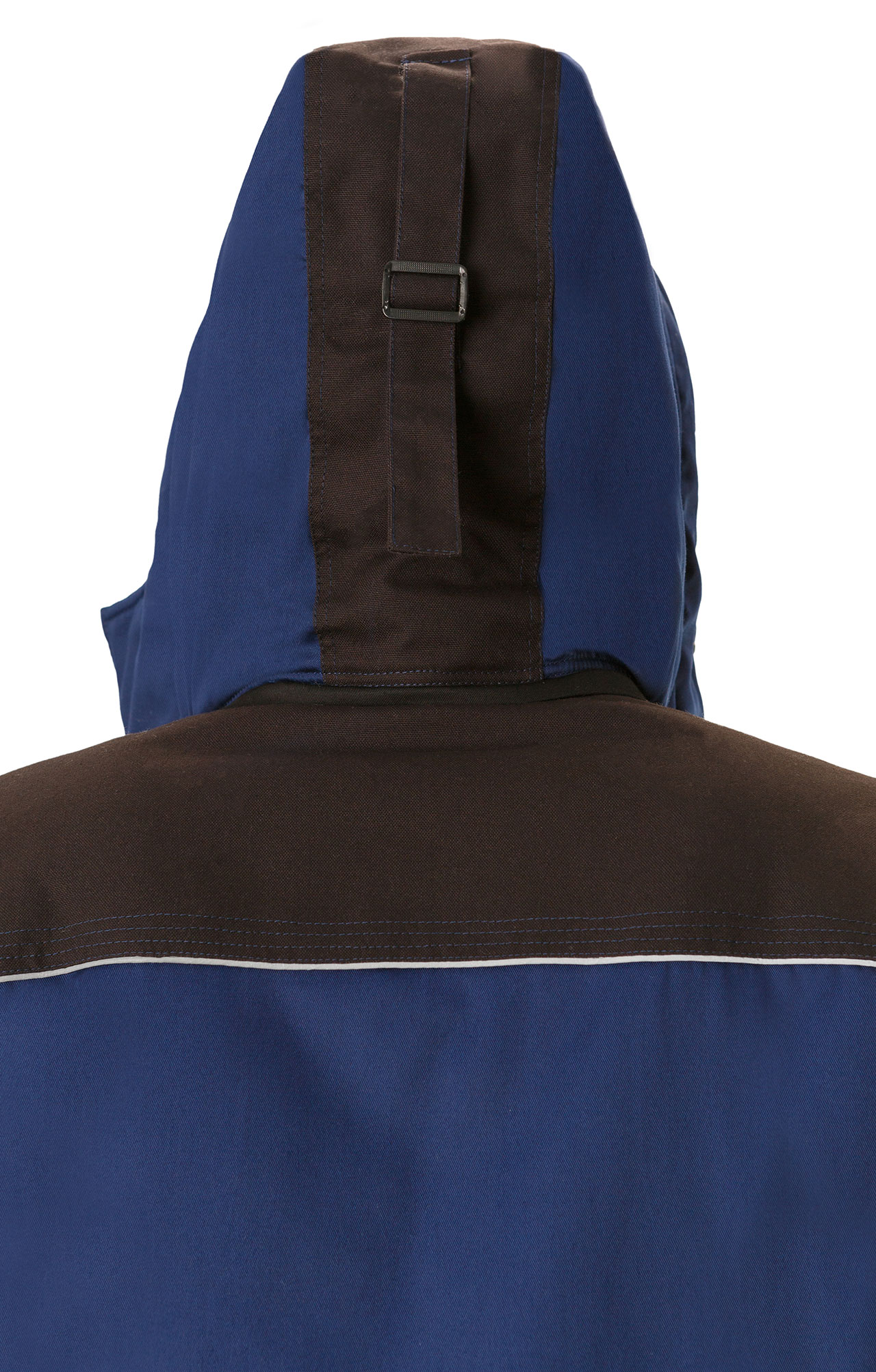 - Под лицевым вырезом капюшон застегивается на две кнопки, регулирующие прилегание в два положения.