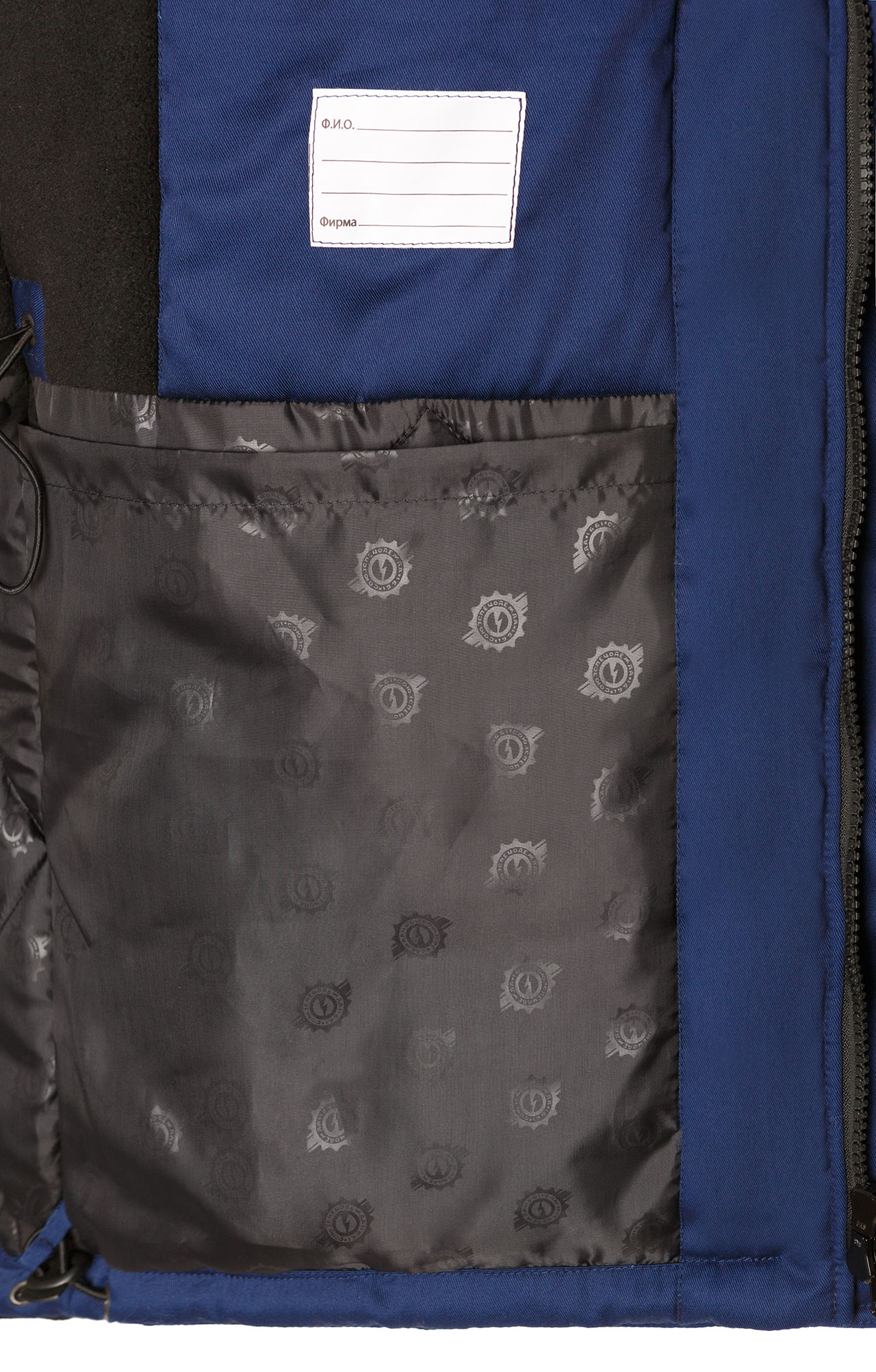 - Левая полочка подкладки с нагрудным накладным карманом, застегивающимся на тесьму молнию, и нижним накладным карманом формата А4.